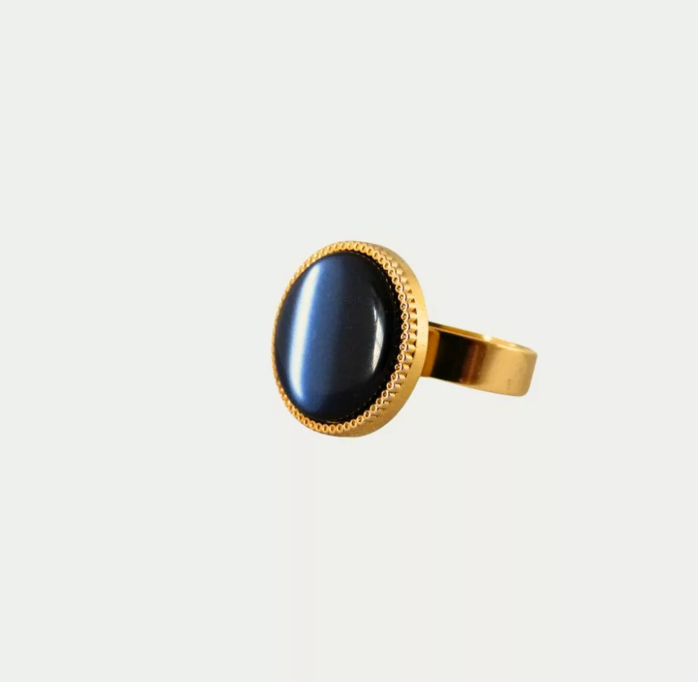 Sur la bague Anna, une collerette de métal doré habille un somptueux plateau en résine bleue où joue la lumière. Une bague chic et racée créée à partir d’un bouton recyclé. Anneau réglable sous le plateau doré à l’or fin 24k.
