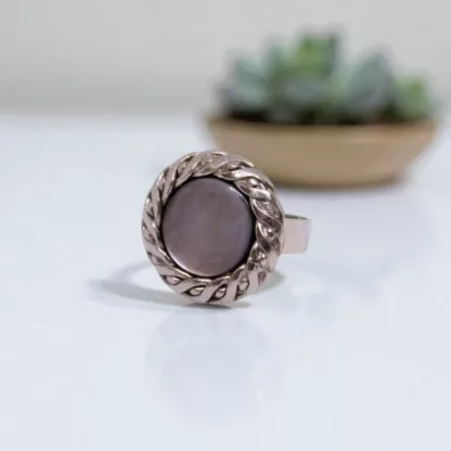 Un bouton ancien nous donne cette belle bague gris ardoise élégante et racée, formée d’une pastille de nacre grise enchâssée dans une tresse de métal argenté. Très facile à assortir, elle accompagnera toutes vos tenues de jour et de soirée. Anneau réglable en acier inoxydable. Exemplaire unique.