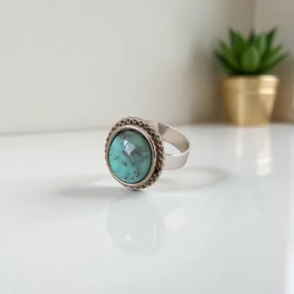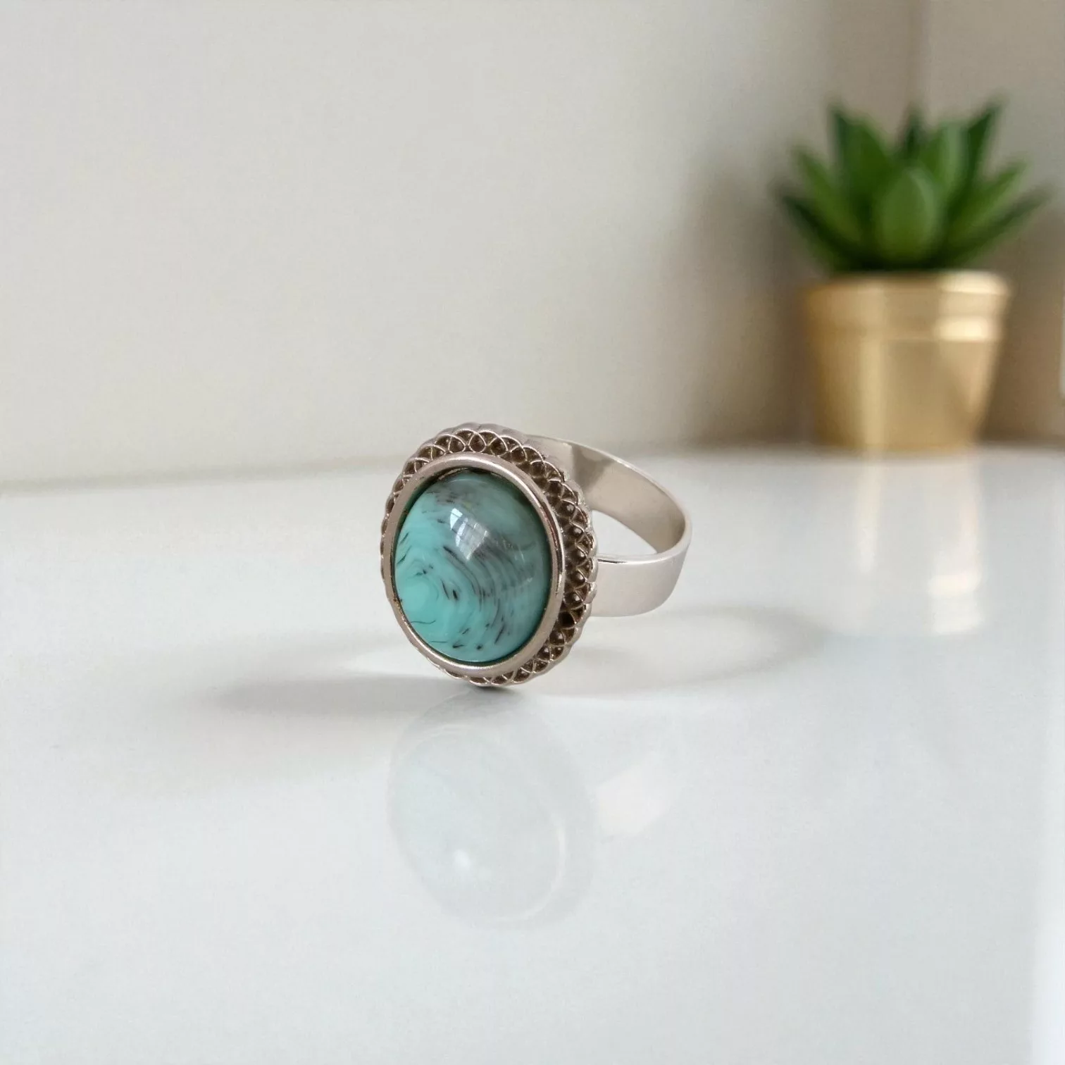 Cette bague Bora-Bora couleur turquoise vous rappellera les eaux cristallines des lagons . Issue du recyclage d’un bouton ancien, elle habillera votre doigt d’une touche colorée et raffinée.