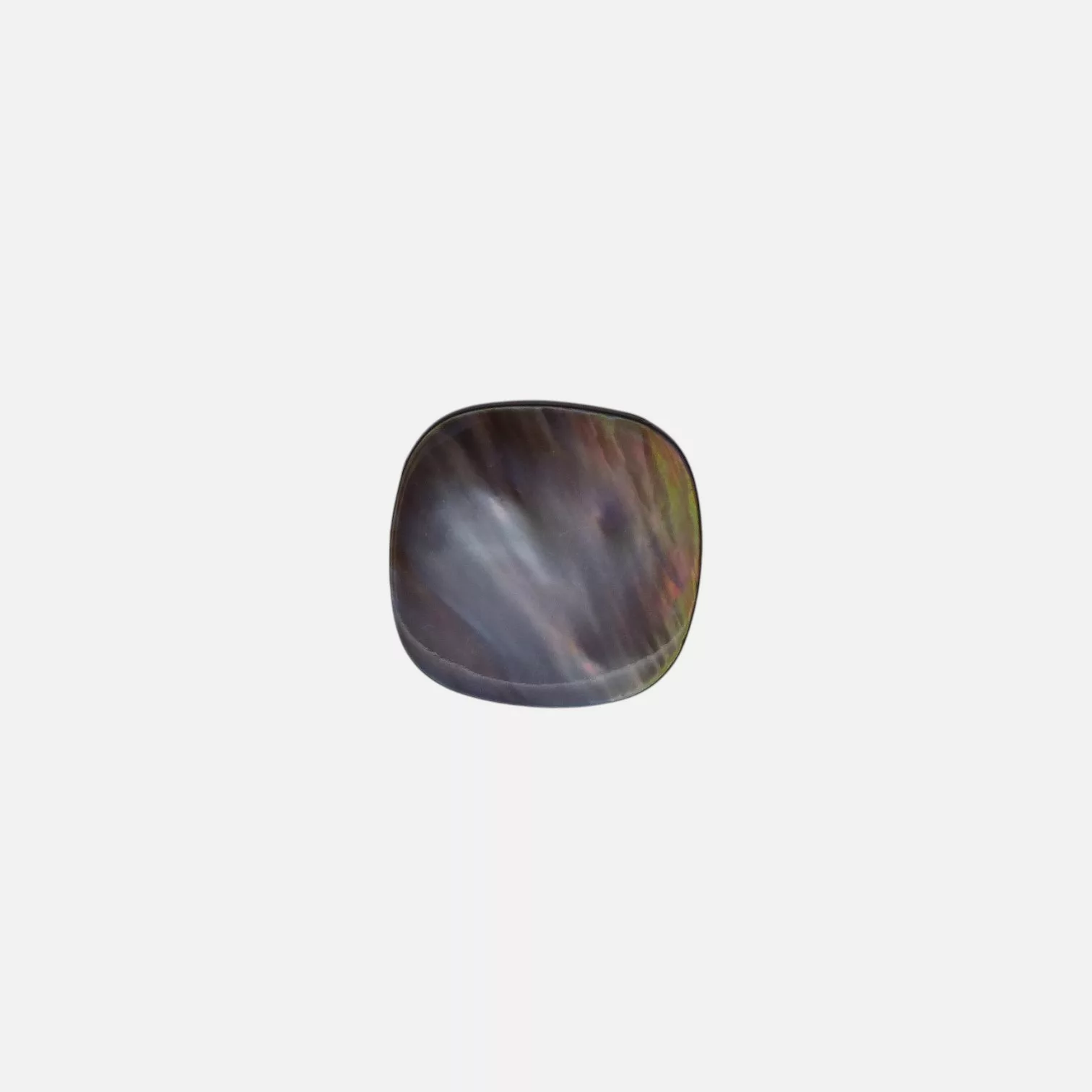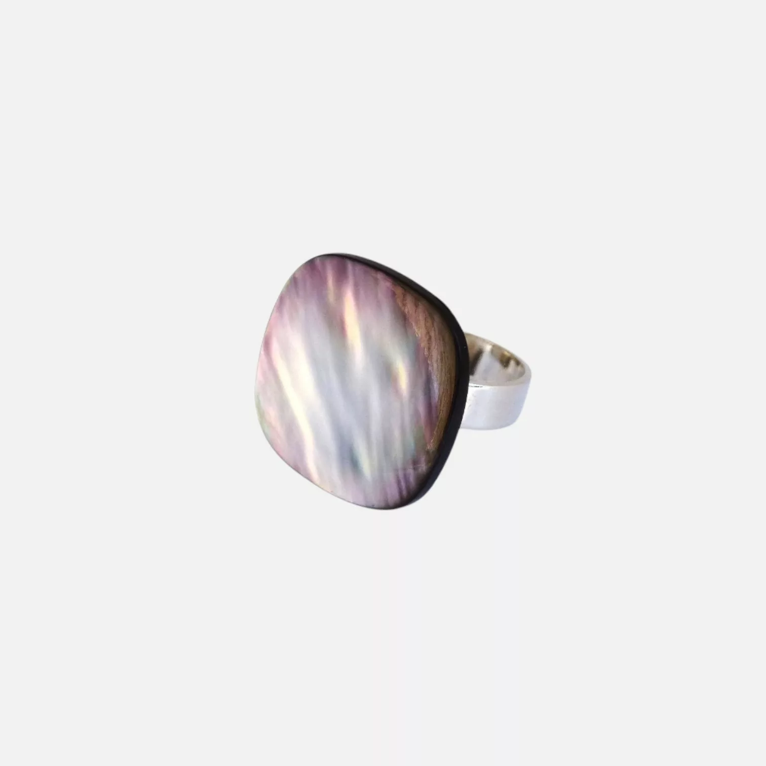 Élégante et intemporelle, la bague Carré de Nacre est réalisée à partir d’un bouton en nacre naturelle aux reflets uniques. Sa surface carrée irisée capte la lumière et révèle des nuances grises, violettes et vertes selon l’angle.