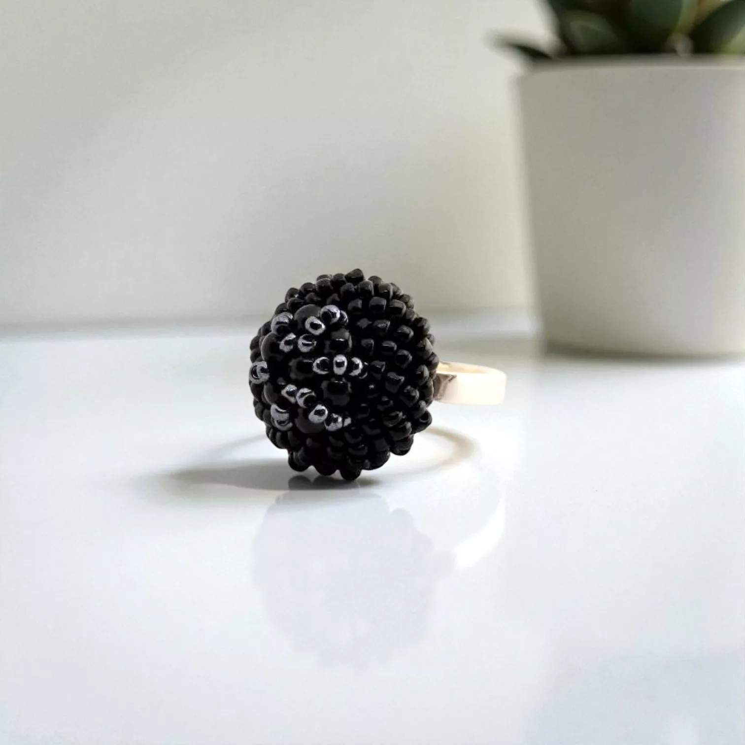 Avec ses fines perles noires, cette bague évoque le précieux caviar. A porter sans modération! Cette bague recycle un bouton ancien et n’existe qu’en deux exemplaires. Anneau réglable en laiton plaqué argent 925. Peut être assortie avec le bracelet caviar.