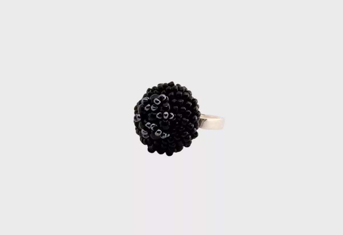 Avec ses fines perles noires, cette bague évoque le précieux caviar. A porter sans modération! Cette bague recycle un bouton ancien et n’existe qu’en deux exemplaires. Anneau réglable en laiton plaqué argent 925. Peut être assortie avec le bracelet caviar.
