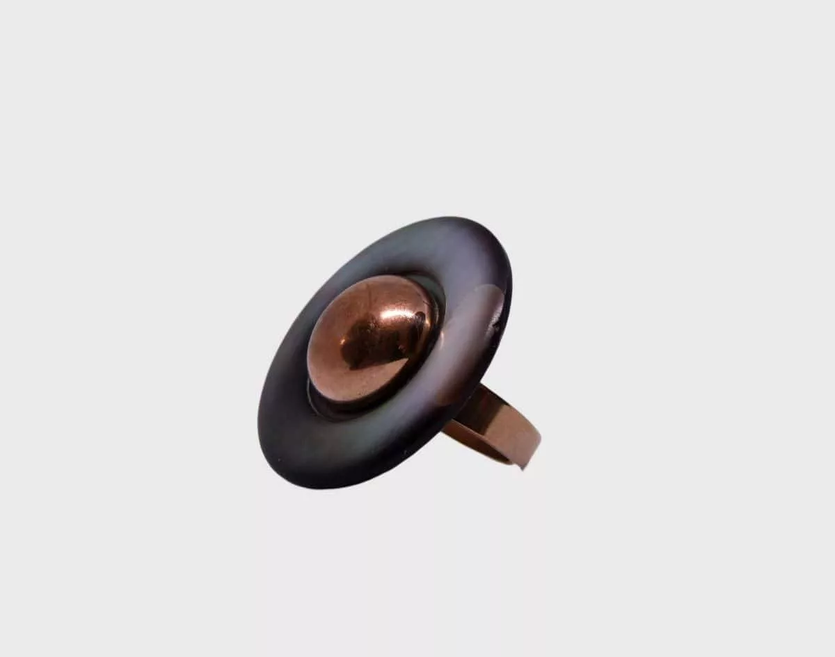 Un cœur aux éclats cuivrés pour cette bague au beau plateau de nacre. Ce modèle associe deux boutons anciens montés sur un anneau réglable en acier inoxydable. Exemplaire unique.