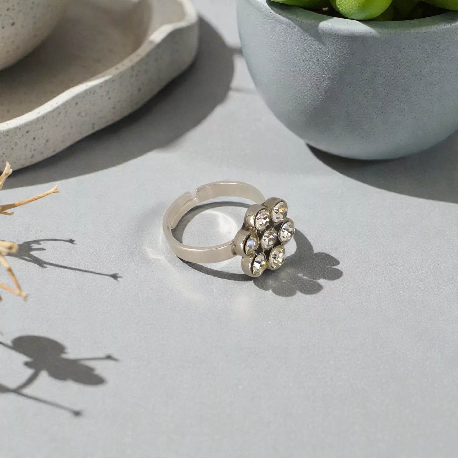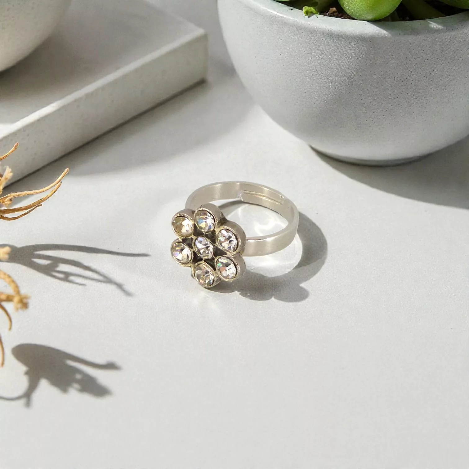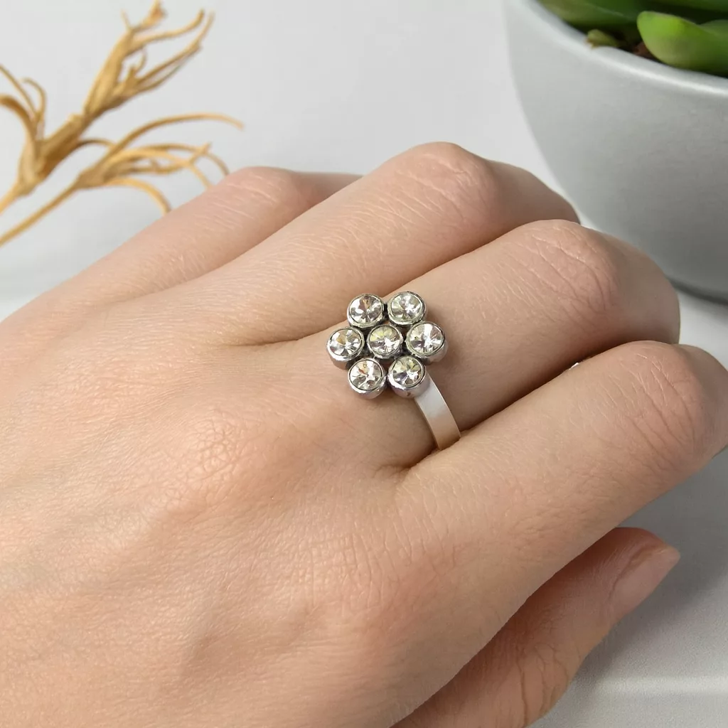 La bague Clara est née de la transformation d’un ancien bouton en un bijou délicat et lumineux. Son motif floral composé de strass transparents capte la lumière avec finesse, offrant un éclat discret mais irrésistible. Une pièce unique qui marie histoire, élégance et modernité.