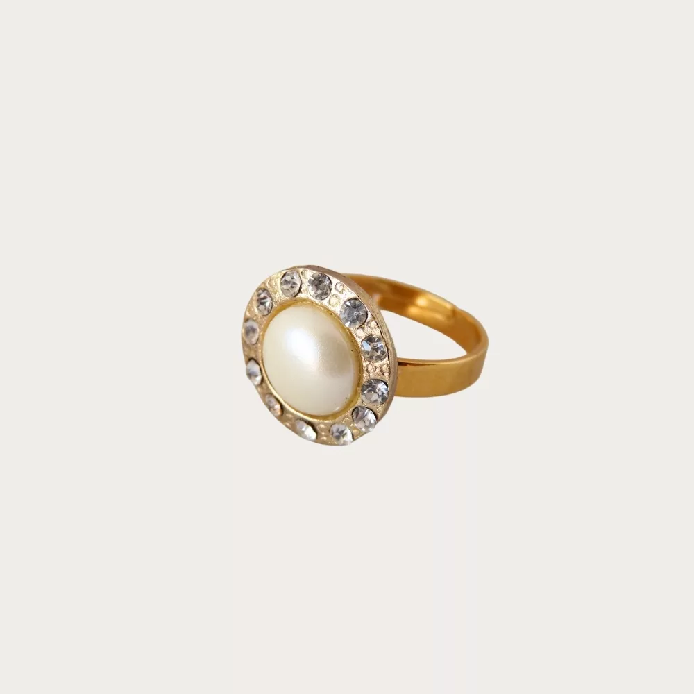 Très jolie bague Diana issue d’un bouton upcyclé dont le cabochon en acrylique nacré est serti de métal doré couronné de strass. Comme une princesse, elle habillera votre doigt de mille feux.