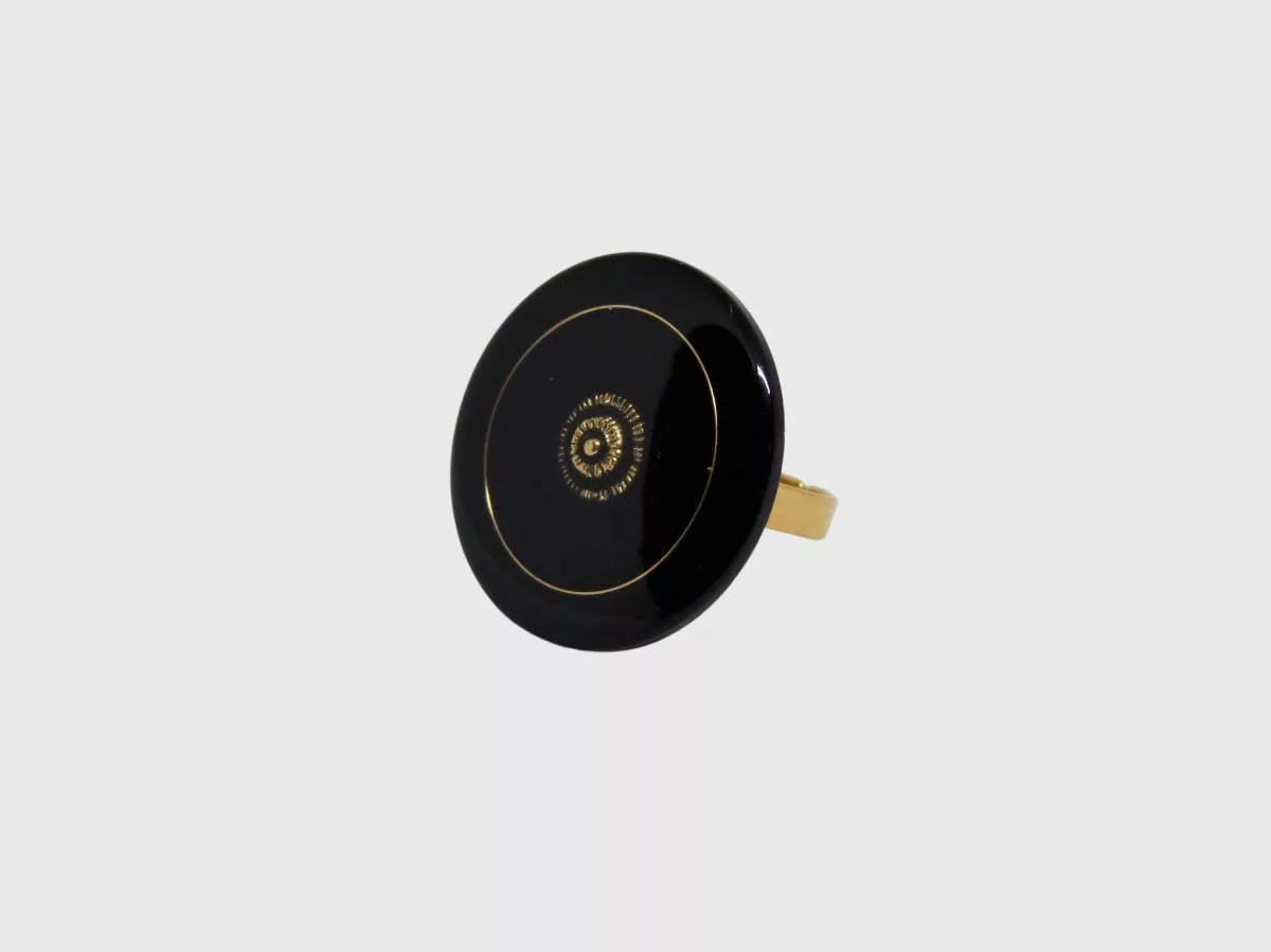 Elle redonne vie à un bouton ancien en résine noire avec incrustations dorées.
