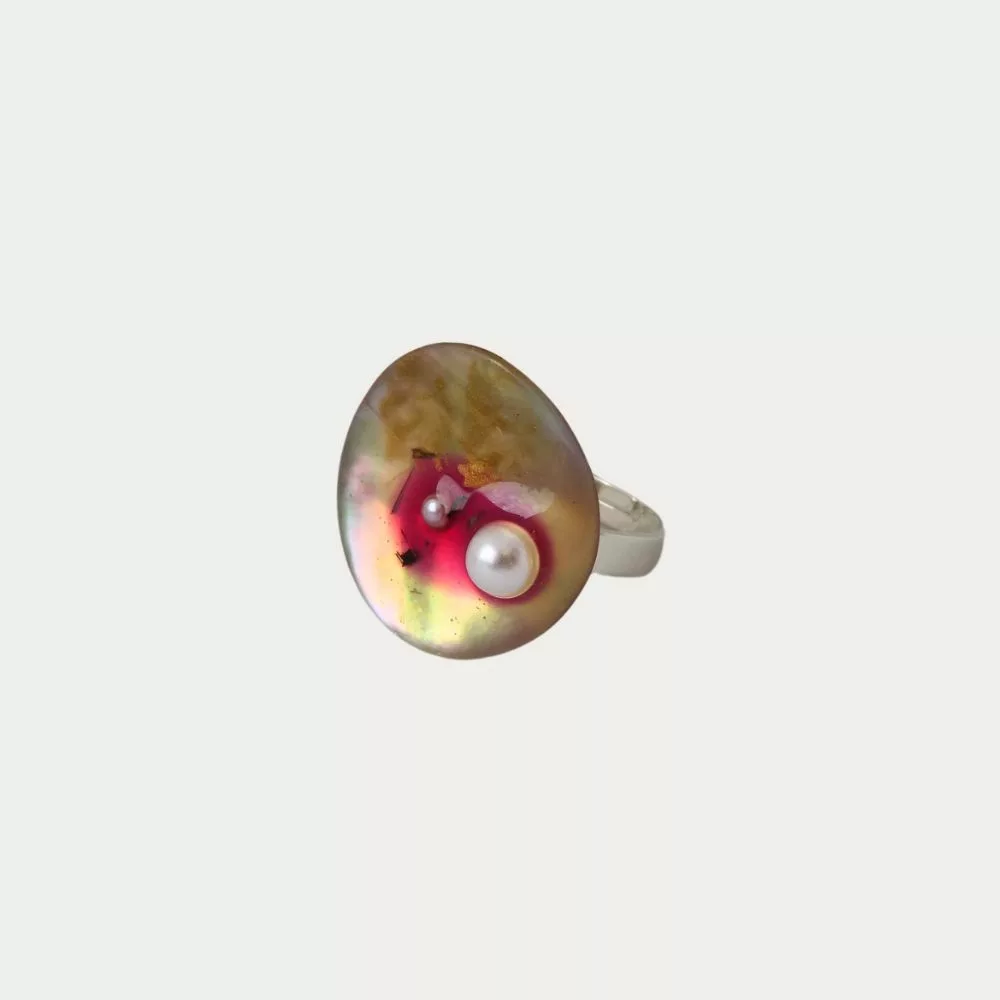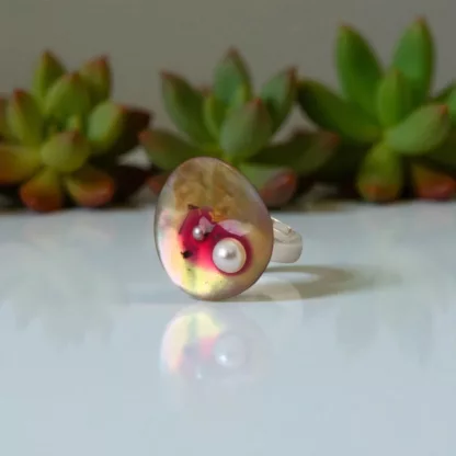 Cette bague Huître est exceptionnelle! Découvrez ce somptueux plateau de nacre où naissent deux perles blanches dans un éclat rose fuchsia. Cette bague nous est offerte par le recyclage d’un ancien bouton.
