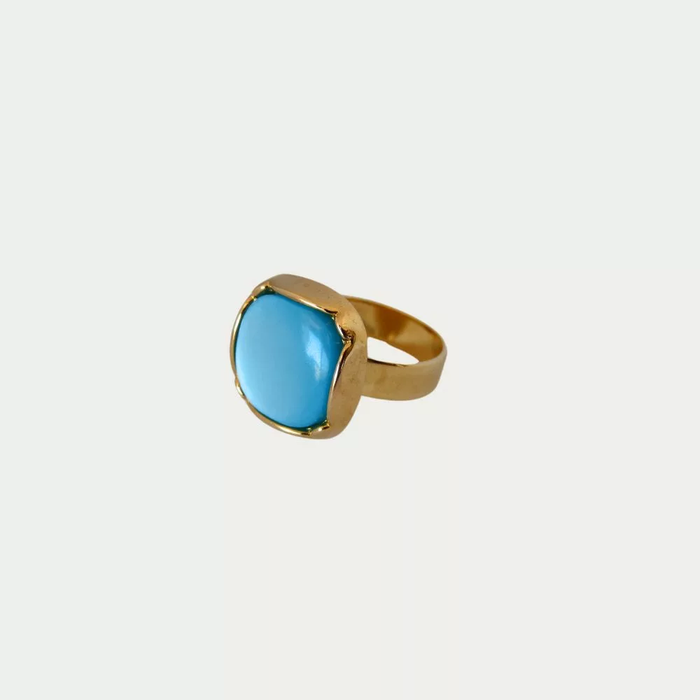 Magnifique bague Lagon chevalière. Sertie de métal doré, cette bague sera l’ornement ultra tendance de votre doigt. A porter en toute occasion pour prolonger l’été! Bague issue du recyclage d’un ancien bouton. Anneau ajustable doré à l’or fin 24 K.