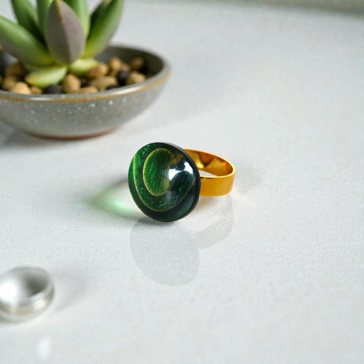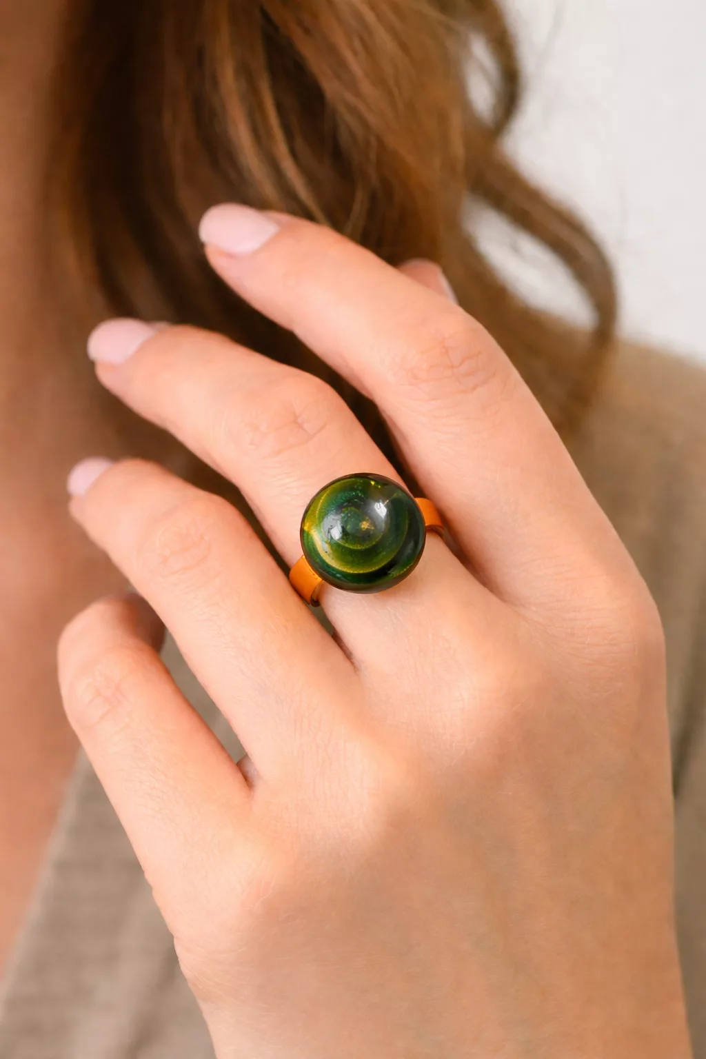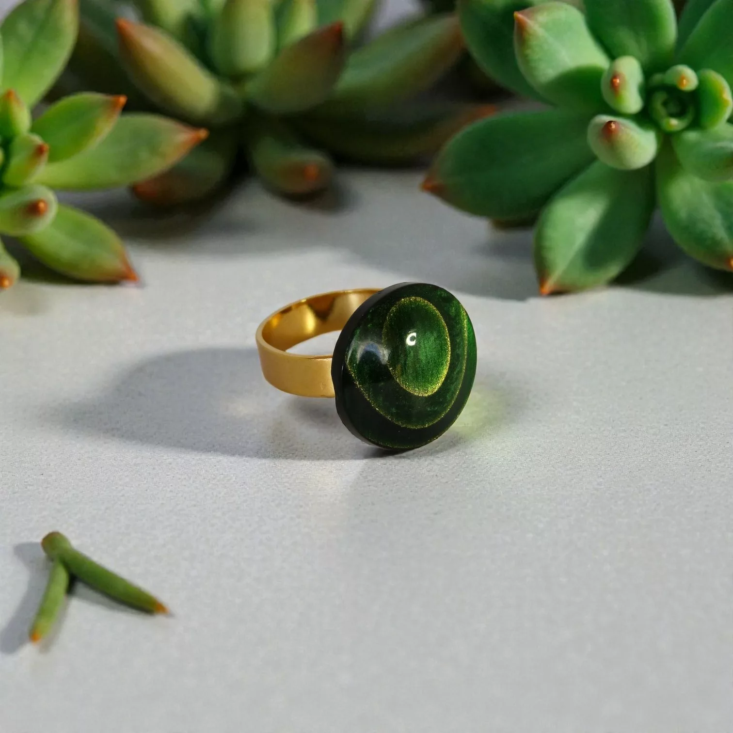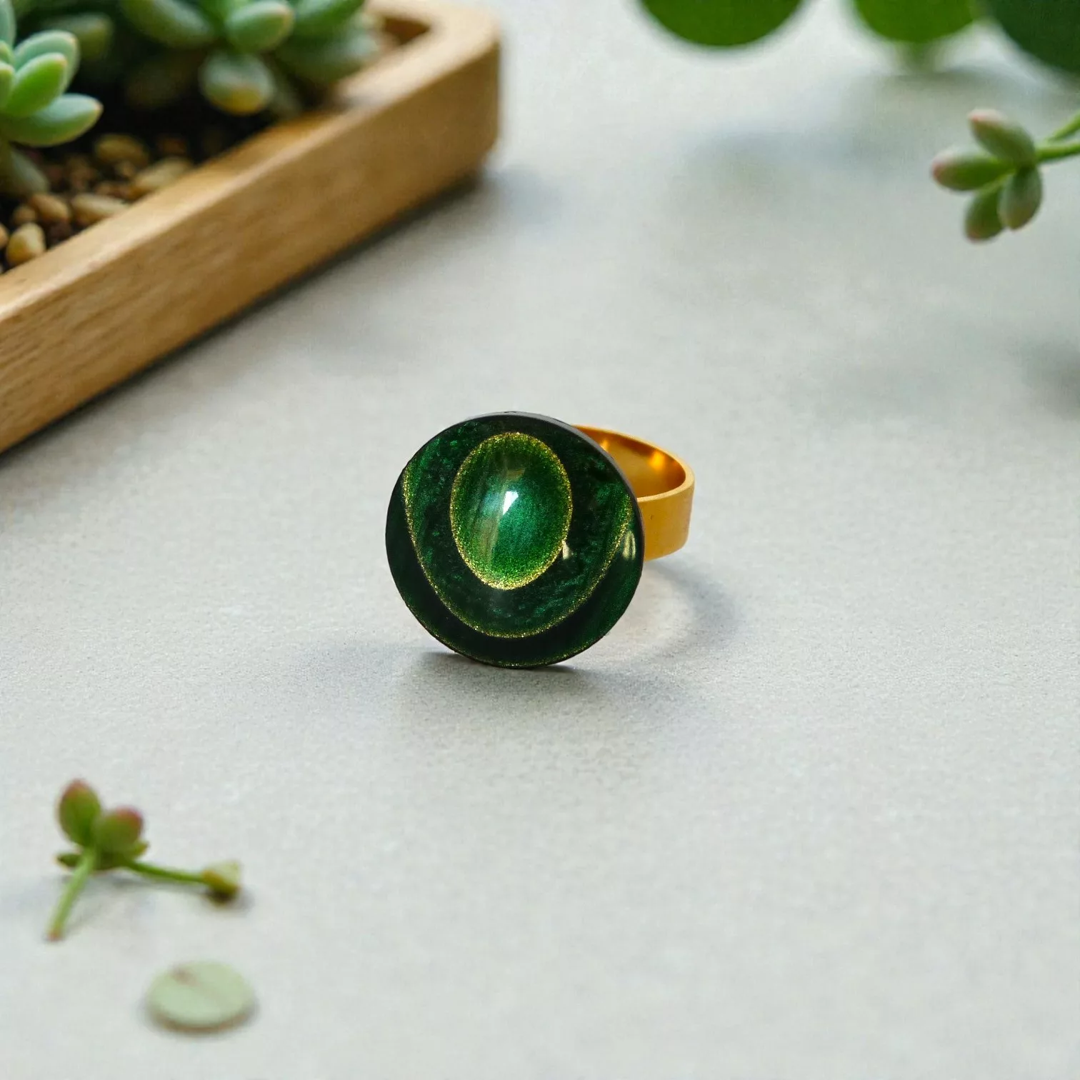 Le bouton, aux reflets verts profonds et lumineux, capte la lumière et révèle de subtiles nuances selon les mouvements. Monté sur un anneau doré, il crée un contraste élégant entre matière vintage et ligne moderne.