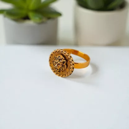 Bague Lion en métal doré qui met en vedette un ancien bouton à effigie de lion en relief. Elégante et racée, cette bague ajustable vous séduira par la finesse de ses détails. Elle habillera votre doigt avec distinction.