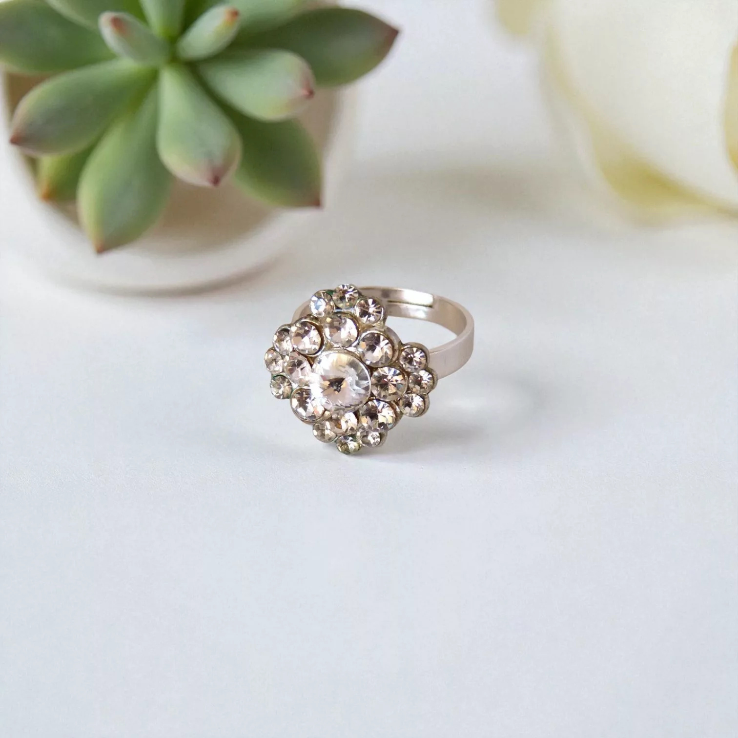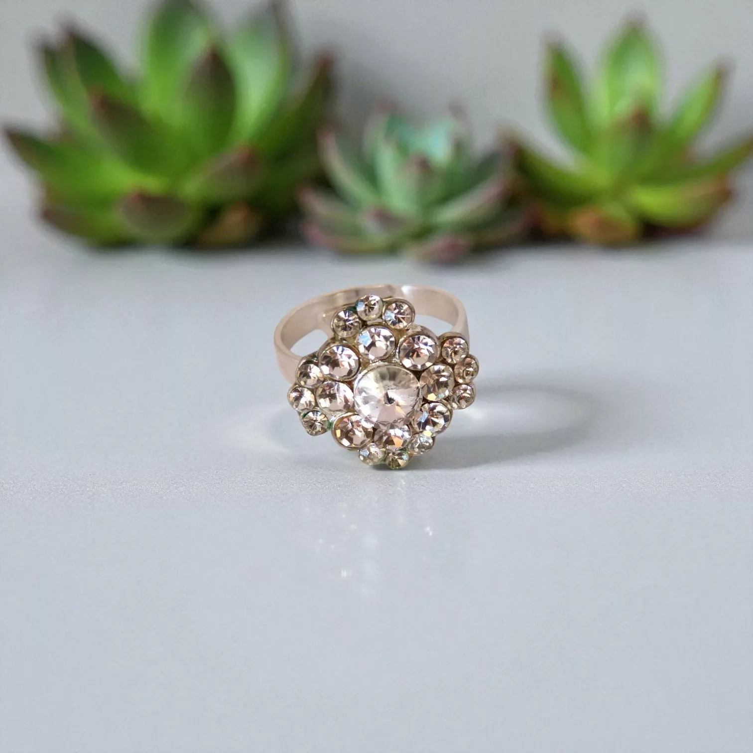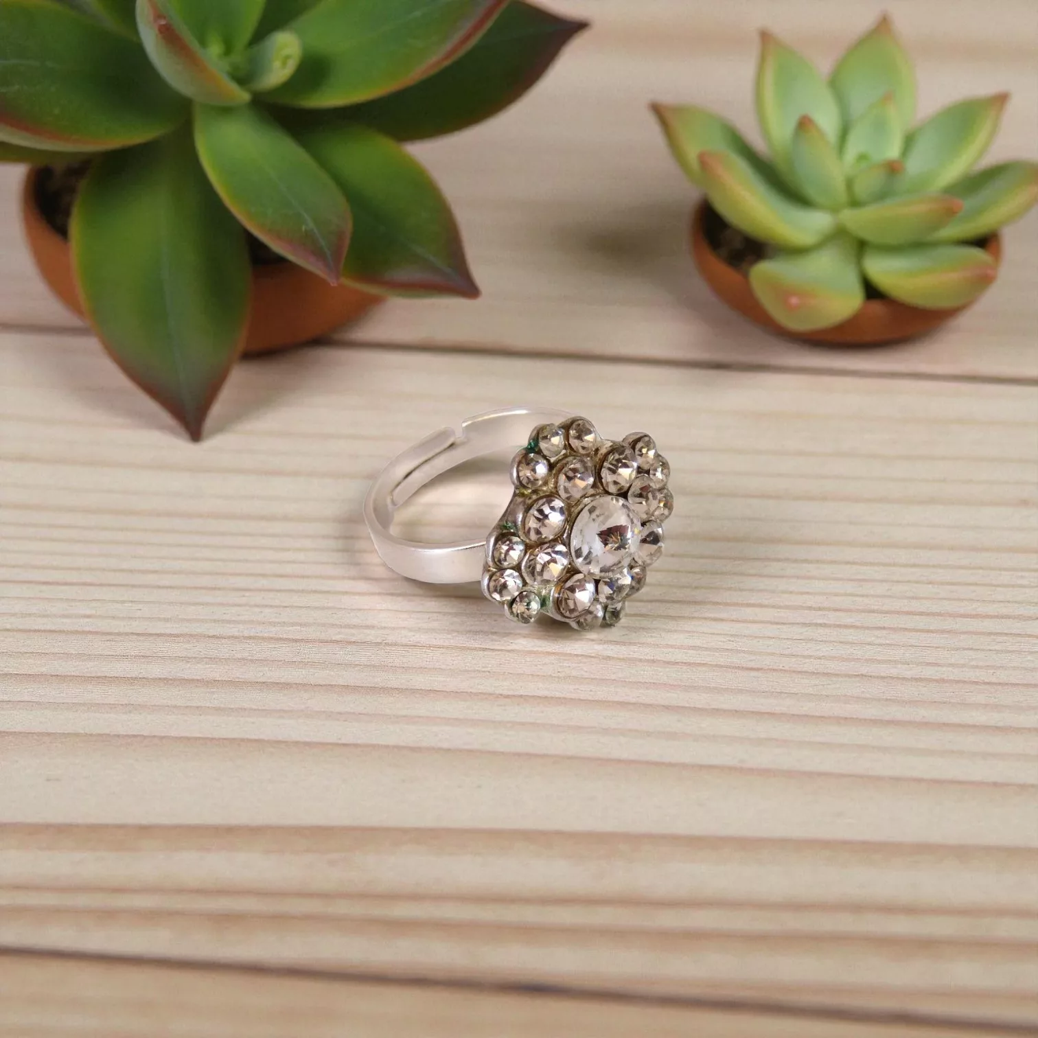 Cette bague unique est façonnée à partir d’un ancien bouton serti de strass, réinventé en bijou éclatant.