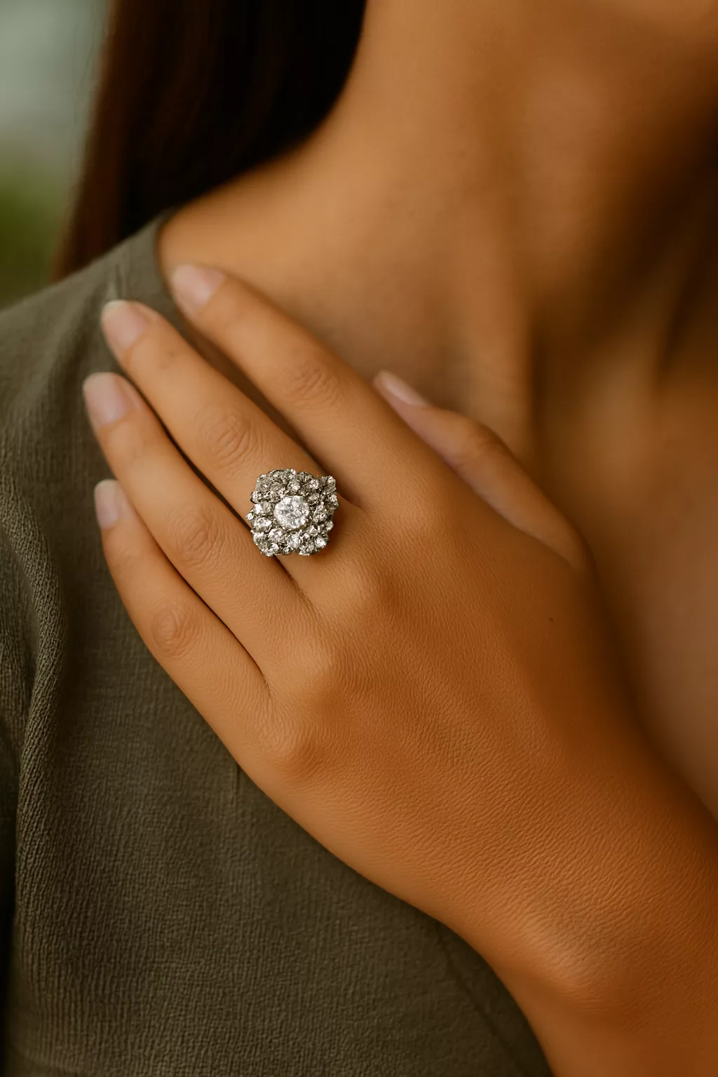 Montée sur un anneau argenté ajustable, elle incarne l’élégance des bijoux anciens et la modernité des formes géométriques.