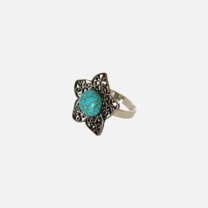 Élégante et singulière, cette bague unique Lotus turquoise a été créée à partir d’un véritable bouton ancien revisité en bijou. Son design floral délicat, mis en valeur par un cabochon turquoise lumineux et des arabesques argentées, en fait une pièce qui mêle héritage et modernité.