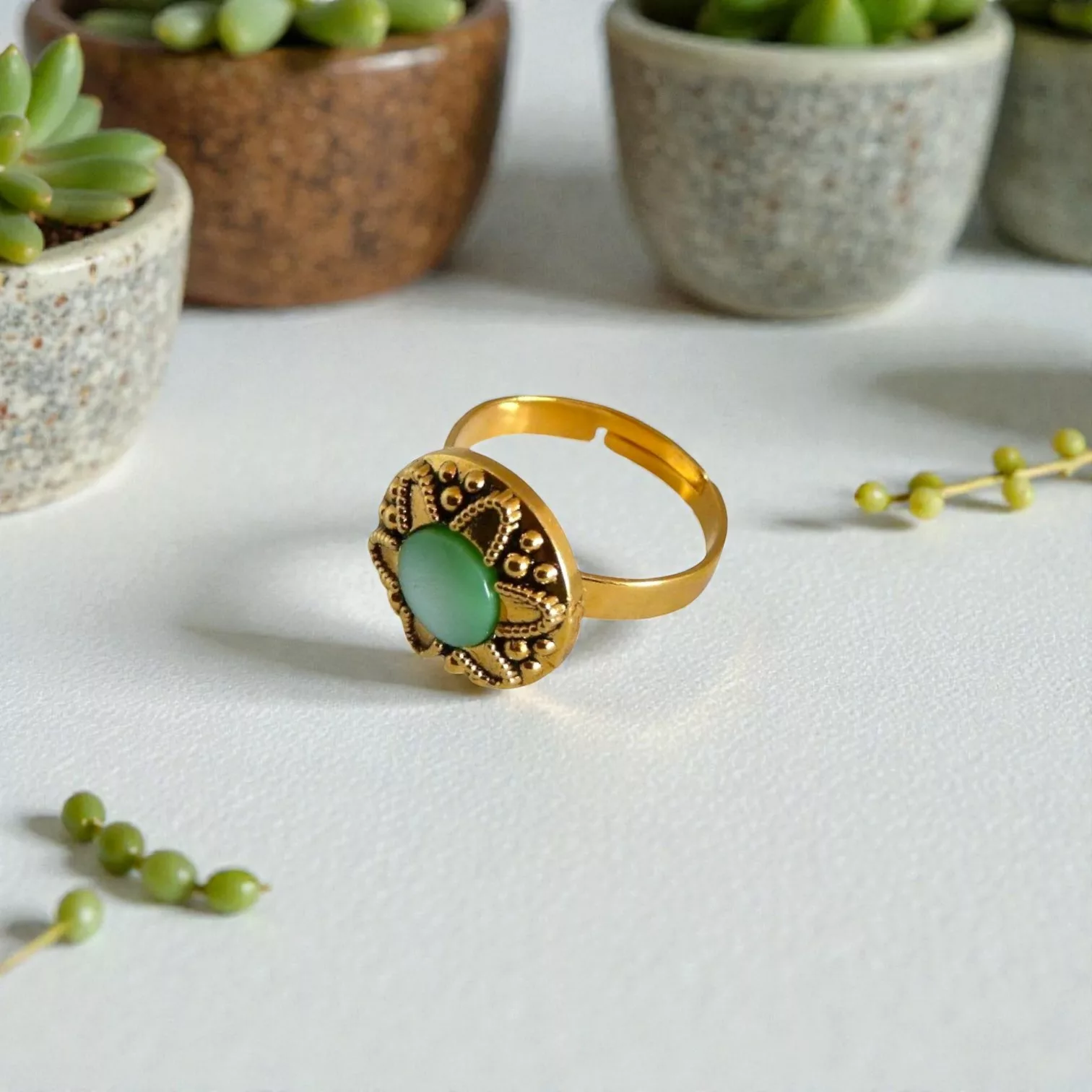 Découvrez la bague « Lueur Verte », un bijou unique réalisé à partir d’un ancien bouton revisité.