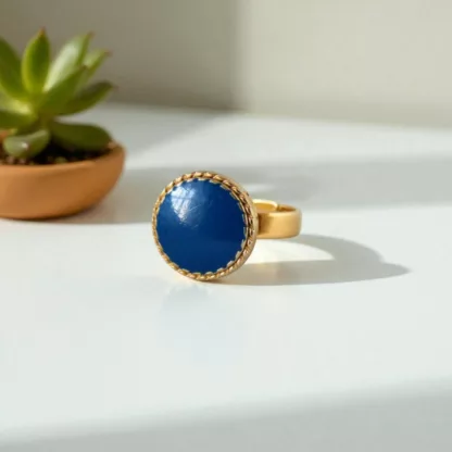 Choisissez cette magnifique bague Outremer au plateau bleu profond cerclé de métal doré. Tous les regards se plongeront dans le bleu outremer de ce bijou qui recycle un bouton ancien. Anneau réglable en laiton doré à l’or fin 24K.