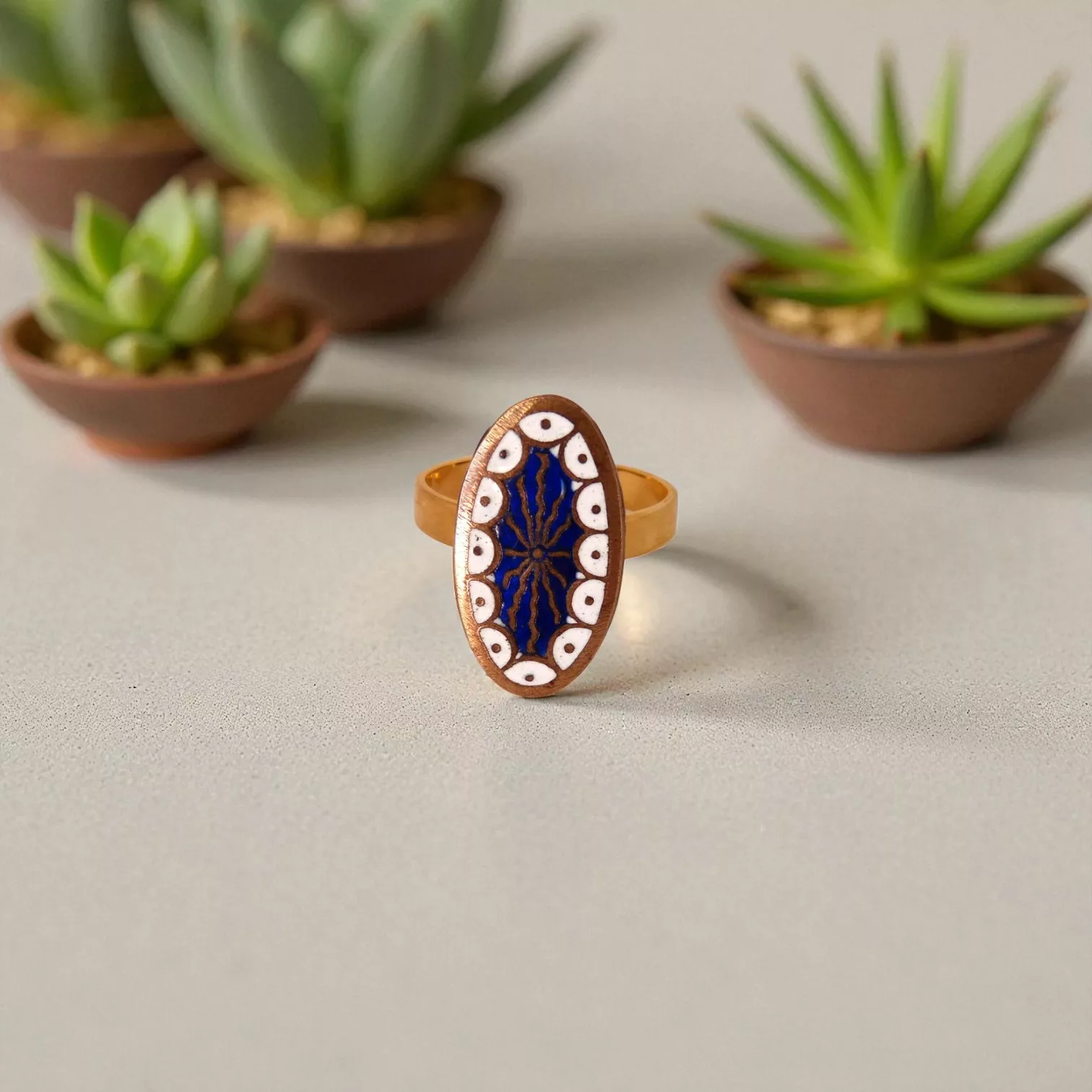 Son cabochon ovale dévoile un bleu profond veiné d’or, encadré d’un motif blanc ponctué de cuivre.