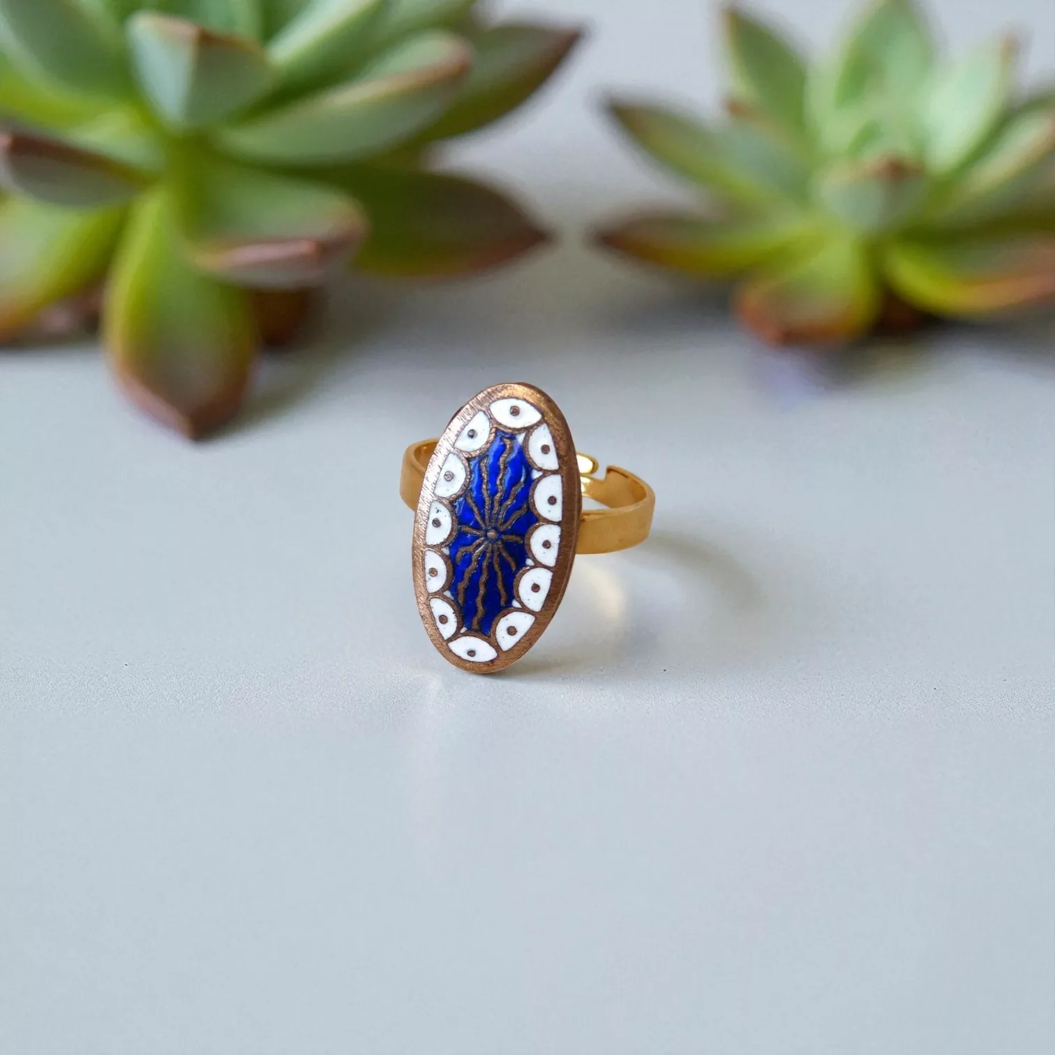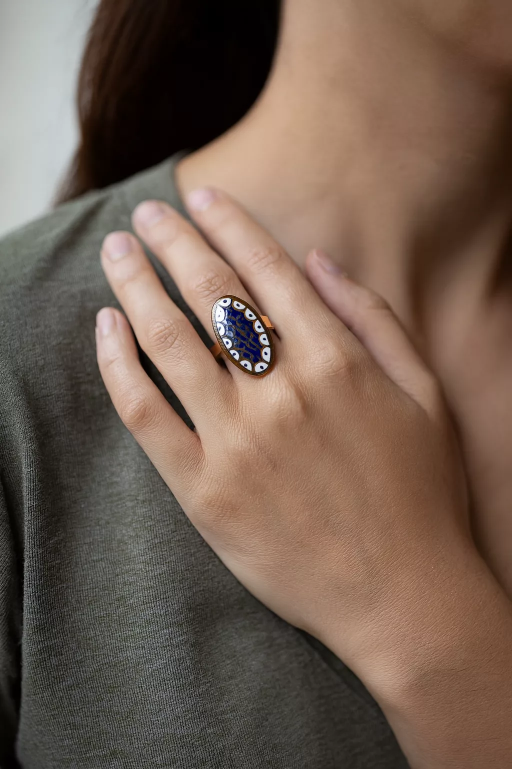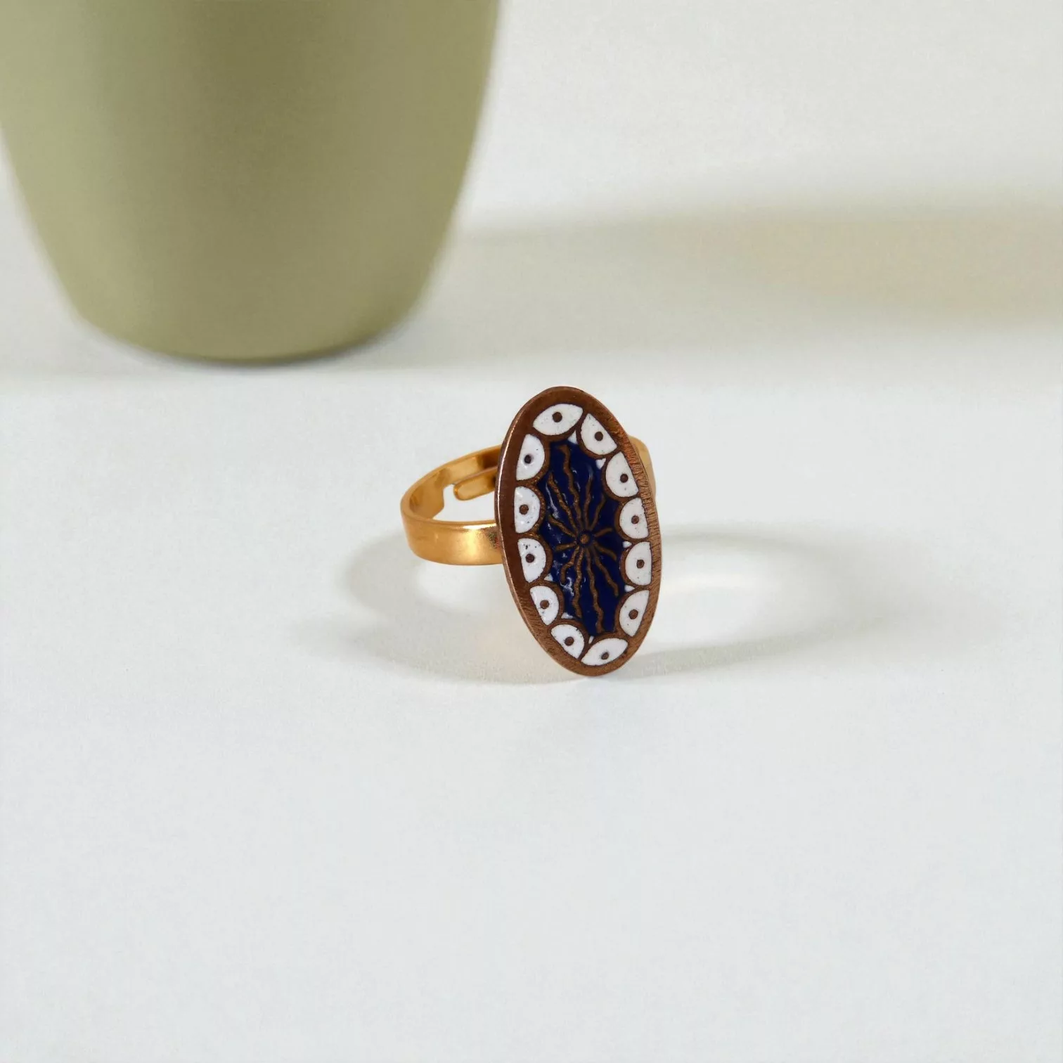 Un bijou qui traverse le temps. La bague  » Ovale céleste » est née de la transformation d’un ancien bouton de manchette émaillé monté sur un anneau ajustable. Son cabochon ovale dévoile un bleu profond veiné d’or, encadré d’un motif blanc ponctué de cuivre.