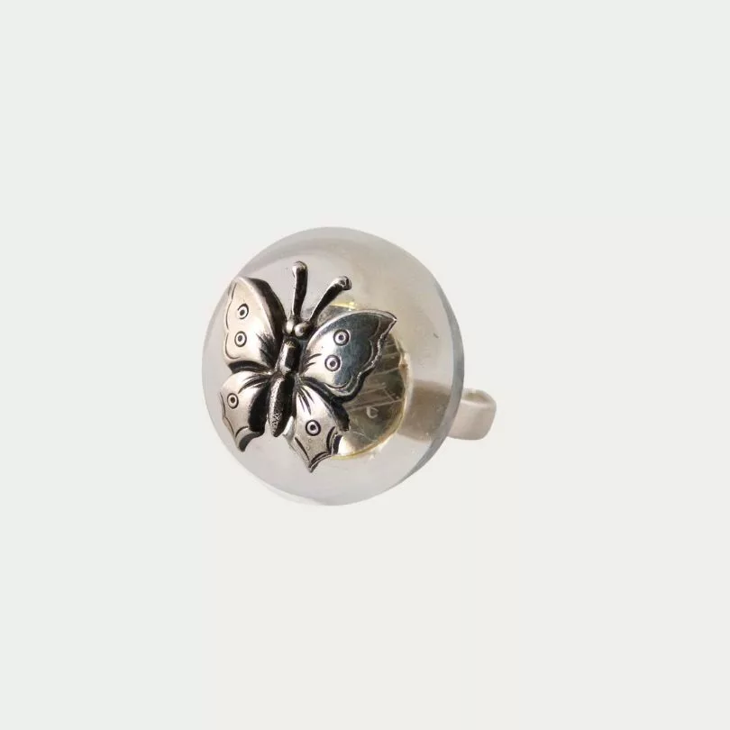Un papillon posé sur un dôme translucide: un motif original et un exemplaire unique pour cette bague qui recycle un bouton ancien. Anneau réglable en laiton plaqué argent 925.