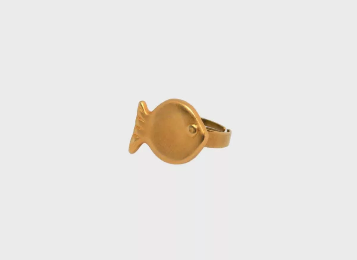 Pour natives du signe du poisson et pour toutes celles qui osent un style décalé de bijoux. Ravissante bague en métal brossé doré issue d’un bouton ancien. Anneau réglable en laiton doré à l’or fin 24 k.