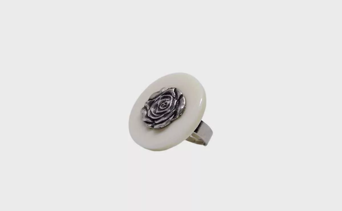 Exemplaire unique pour cette bague qui séduira par son look épuré. Plateau en matière synthétique blanche orné d’une rose en métal. Cette bague qui recycle deux boutons anciens habillera avec distinction tous les doigts grâce à son anneau ajustable en acier inoxydable.