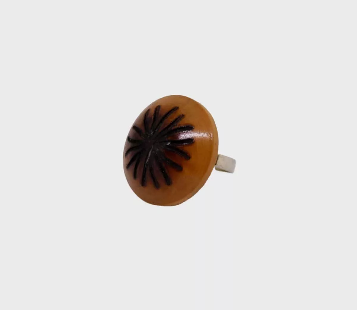 Un matériau noble pour cette bague issue du recyclage d’un bouton ancien en bois blond vernis. Laissez-vous tenter par ce bijou éthique monté sur un anneau ajustable en laiton plaqué argent 925. Exemplaire unique issu du recyclage d’un bouton ancien.