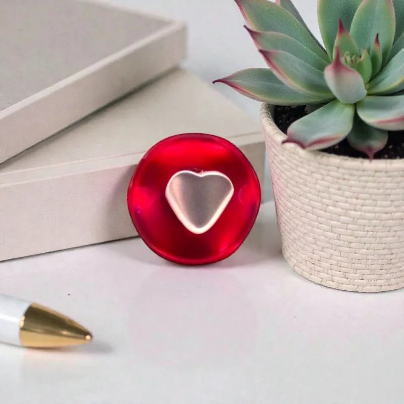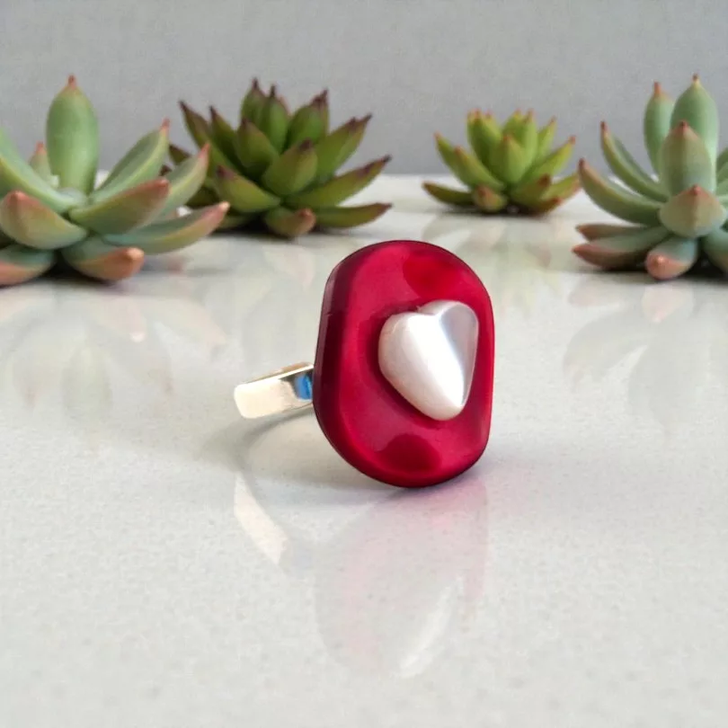 De subtils jeux nacrés pour cette bague Saint-Valentin qui n’existe qu’en un seul exemplaire. Elle offrira à qui la portera une belle corolle rouge où un petit cœur blanc a été déposé. Modèle créé par association de deux boutons. Anneau en laiton plaqué argent qui s’adapte à tous les doigts.