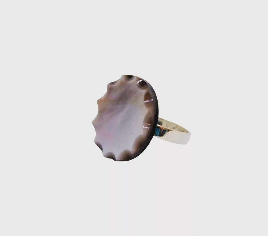 Un très beau plateau de nacre dentelé pour cette bague en exemplaire unique issue d’un bouton ancien. Elle sera pour vous un ornement raffiné qui sublimera vos gestes. Elle s’adapte à tous les doigts grâce à son anneau réglable en laiton plaqué argent 925.