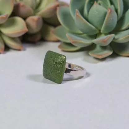 Très jolie bague coussin d’un vert chatoyant qui habillera votre doigt avec élégance. Modèle original et unique provenant d’un bouton ancien en résine upcyclé. Anneau ajustable en laiton plaqué argent 925.