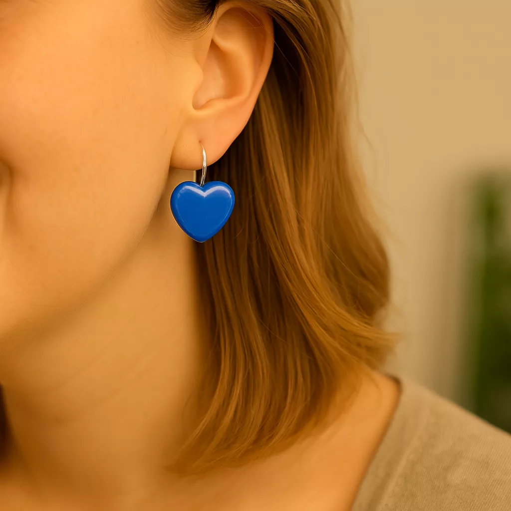 Les boucles d’oreille Coeur bleu sont nées d’un coup de cœur pour des objets oubliés. Le bouton, autrefois discret, devient ici symbole d’amour et de style. Leur bleu profond rappelle les bijoux rétro des années 80, revisités avec une touche artisanale et contemporaine.