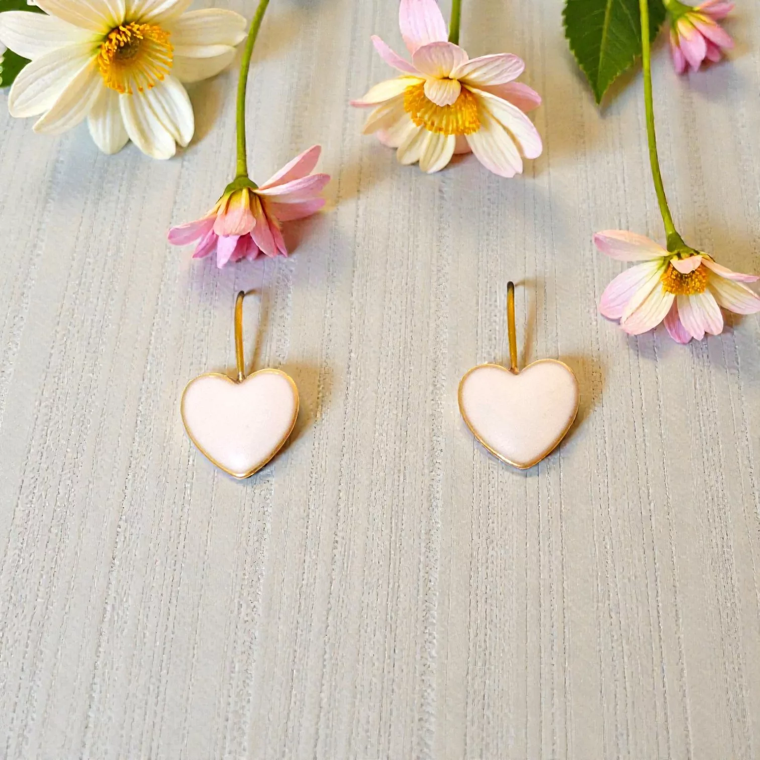 Les boucles d’oreilles » coeurs blancs » sont réalisées à partir d’anciens boutons blancs, soigneusement sélectionnés. Leur teinte blanche, douce et lumineuse, soulignée d’un contour doré, apporte une élégance discrète et intemporelle. Un bijou poétique issu de l’upcycling, à porter au quotidien.