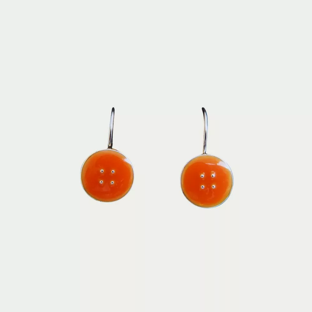 Donnez un coup de frais à votre style avec cette superbe paire de boucles d’oreilles orange. Avec ses quatre trous en trompe l’œil, elle rappelle avec malice les deux anciens boutons qu’elle recycle. Supports en acier inoxydable.