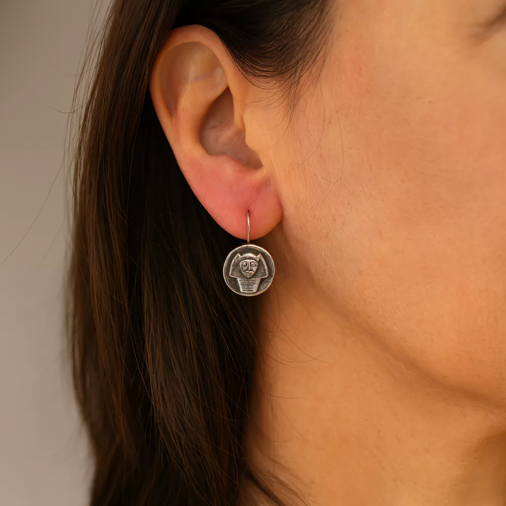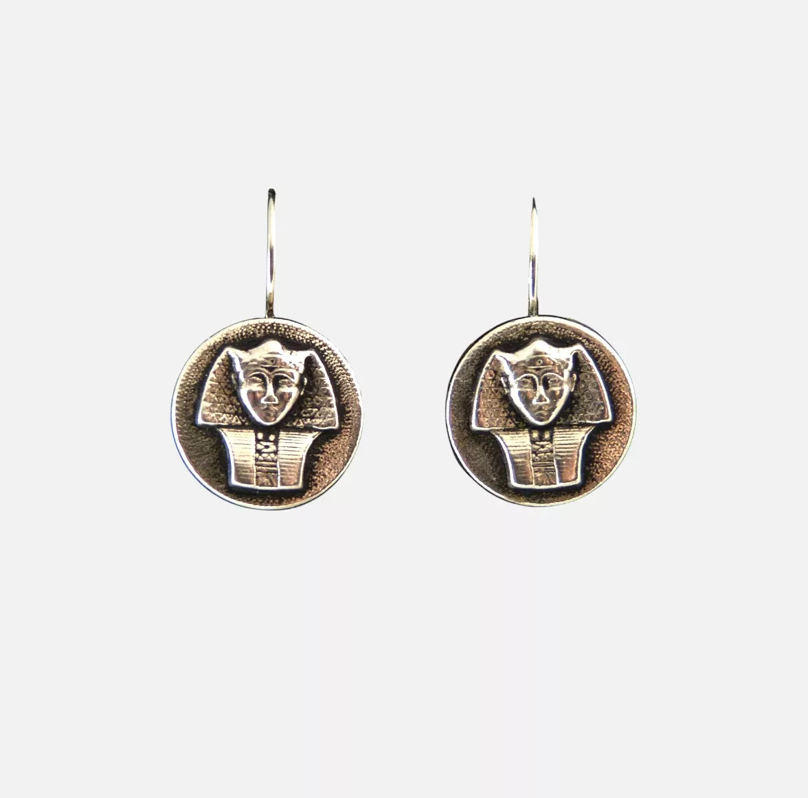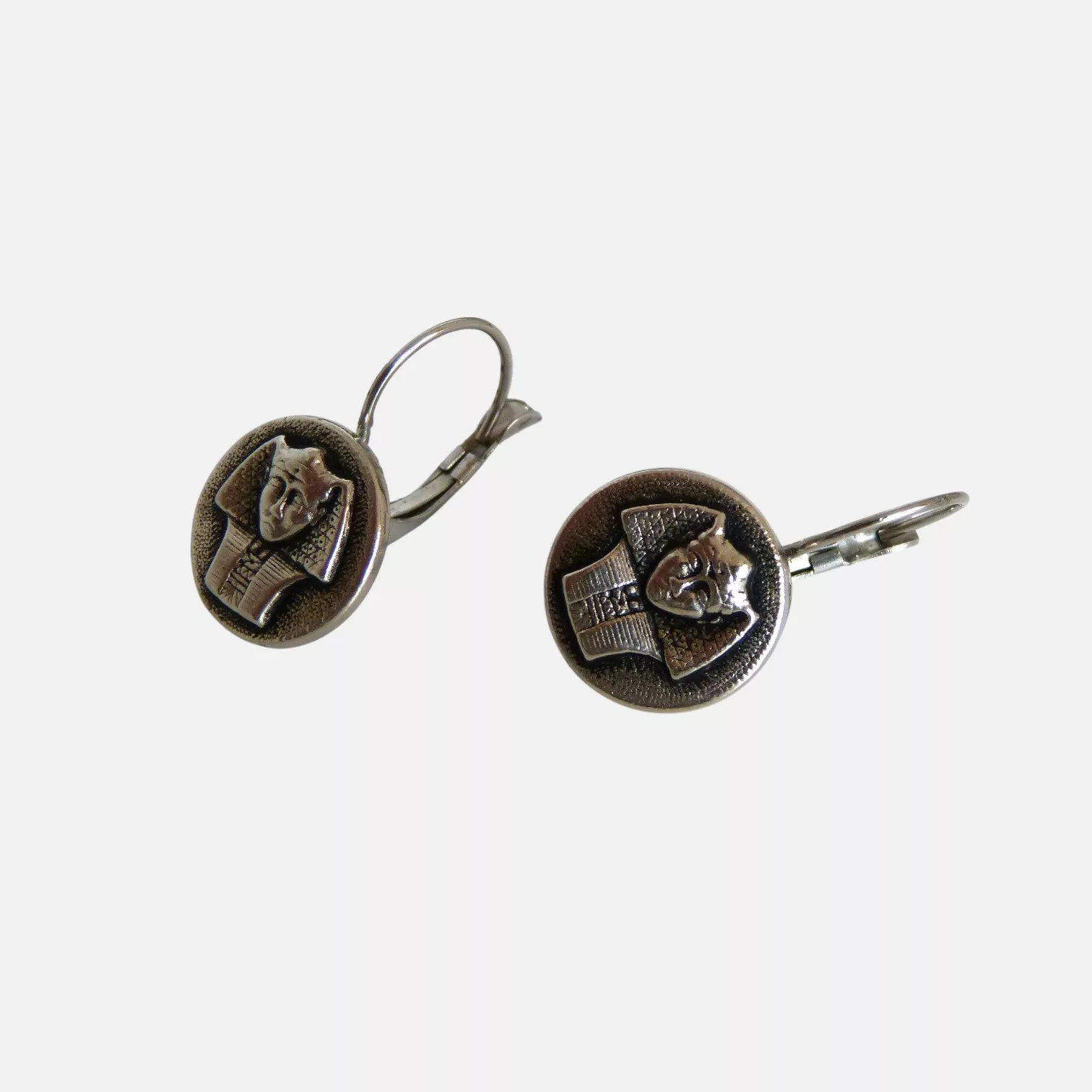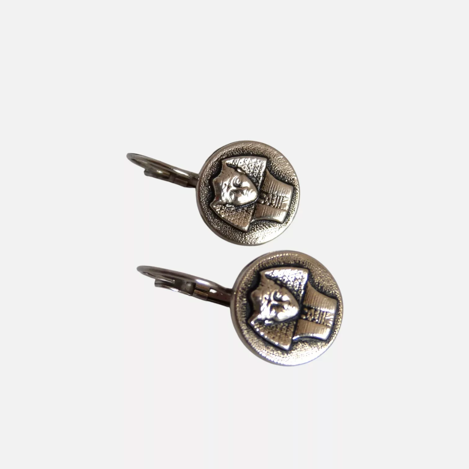 Inspirées de l’Égypte antique, ces boucles d’oreilles Pharaon uniques sont créées à partir de véritables boutons vintage. Le visage du pharaon en relief évoque mystère et élégance. Une pièce artisanale, éthique et pleine de caractère.