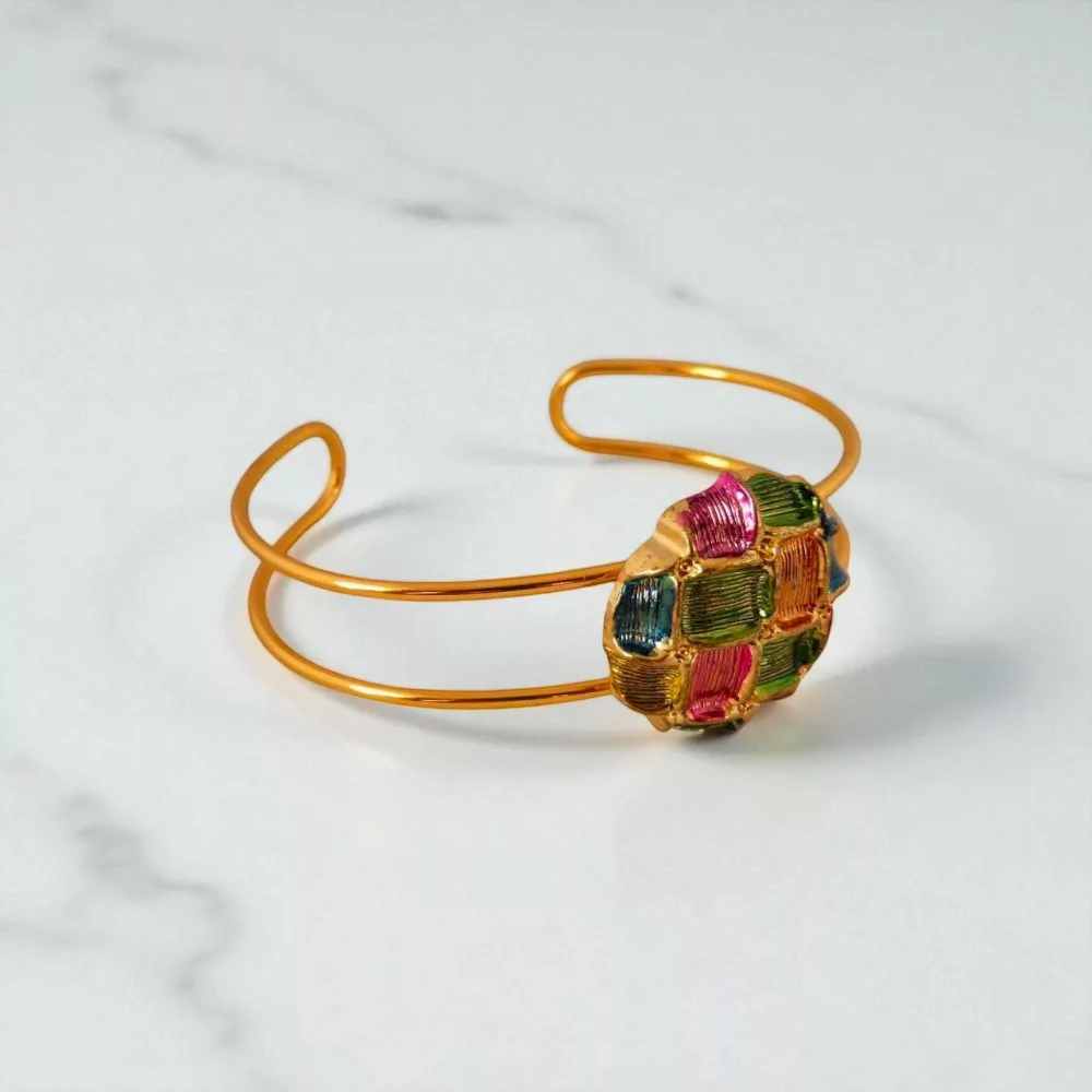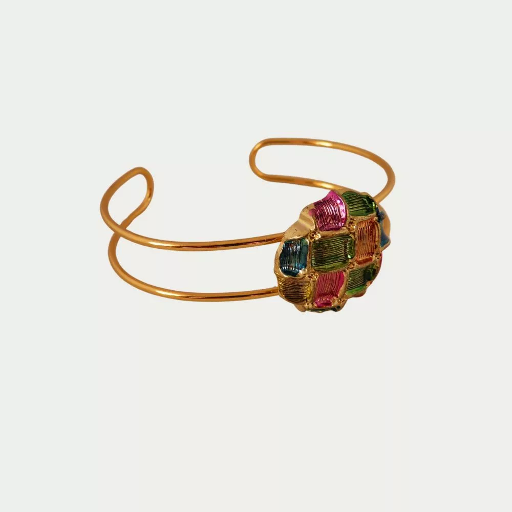 Ce très joli bracelet Arlequin met en scène un bouton ancien à l’élégance colorée. Il habillera votre poignet de ses tons vifs et pétillants.