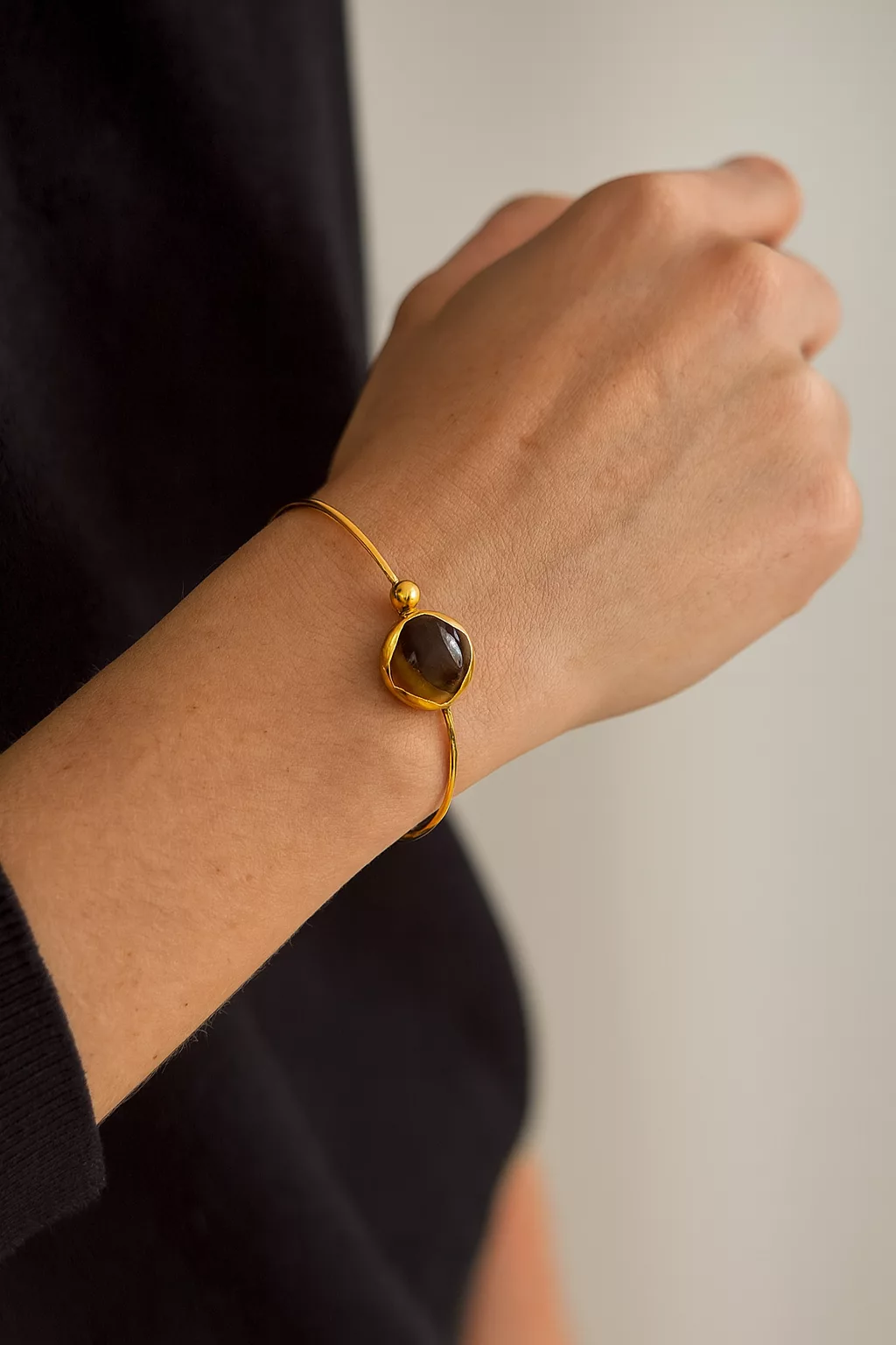 Le bracelet Caramel luxueux,délicat et raffiné est une création réalisée à partir d’un véritable bouton ancien. Monté sur un jonc en métal doré, il marie élégamment charme vintage et design contemporain. Le bouton, aux nuances profondes et chaleureuses, apporte une touche d’authenticité et de caractère à chaque tenue.
