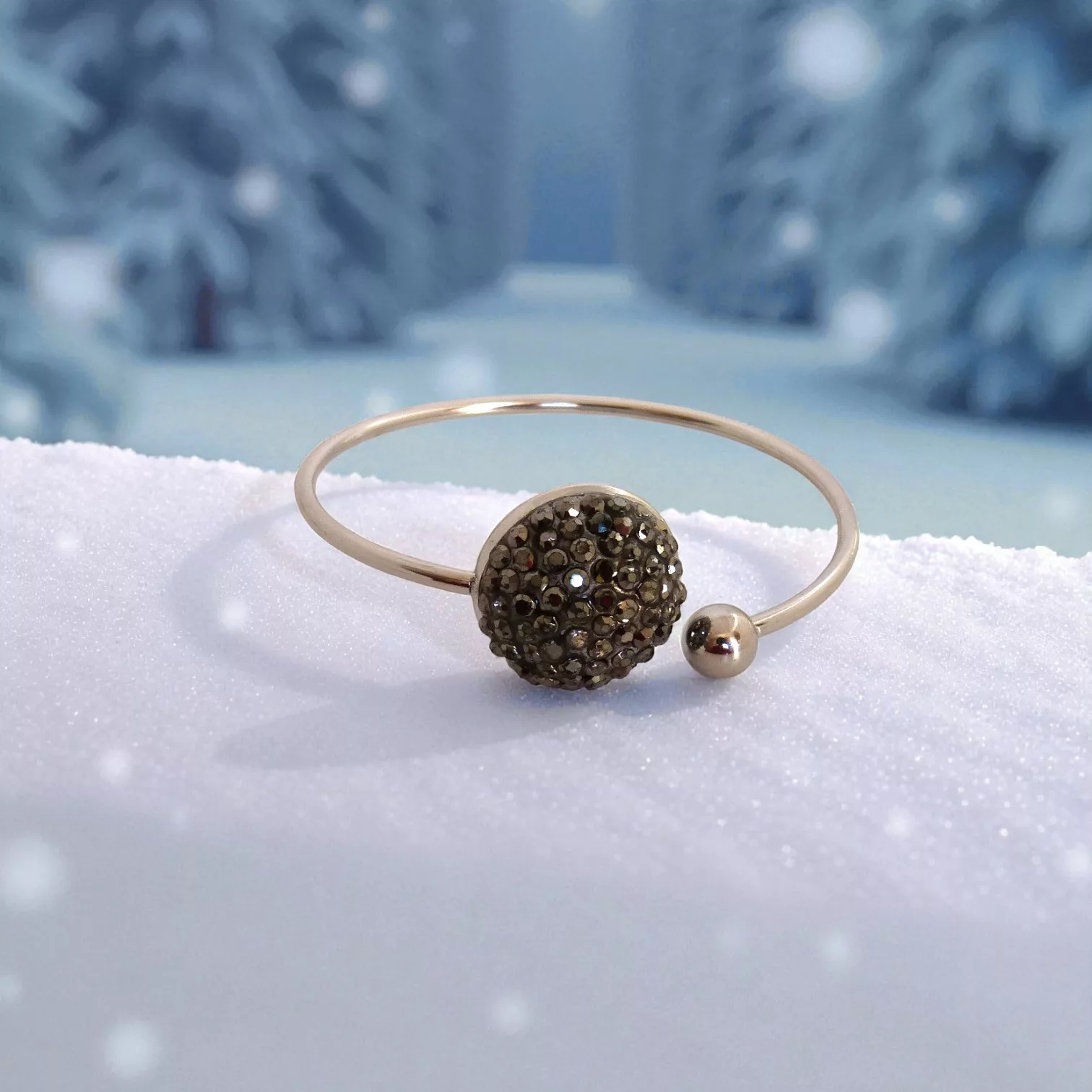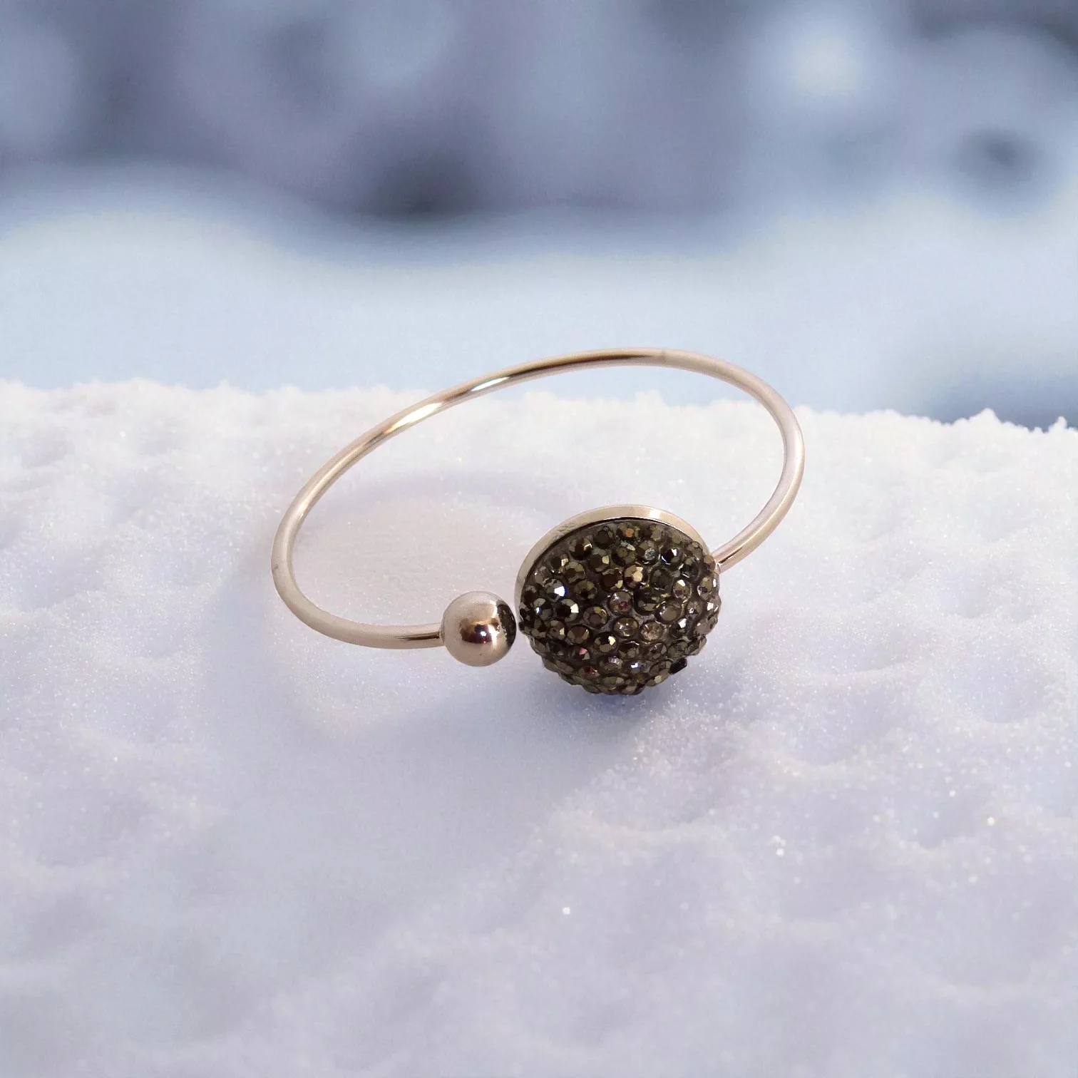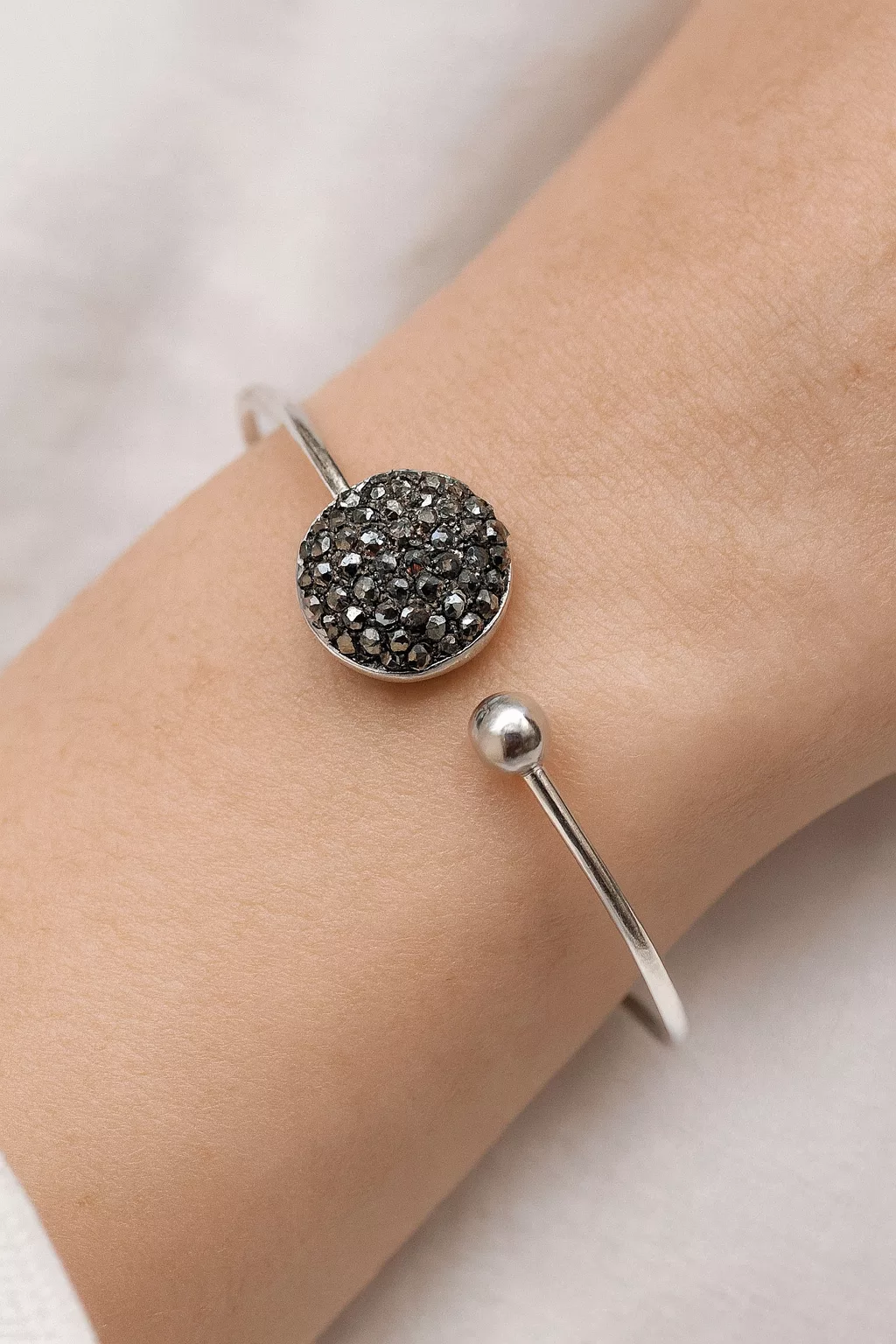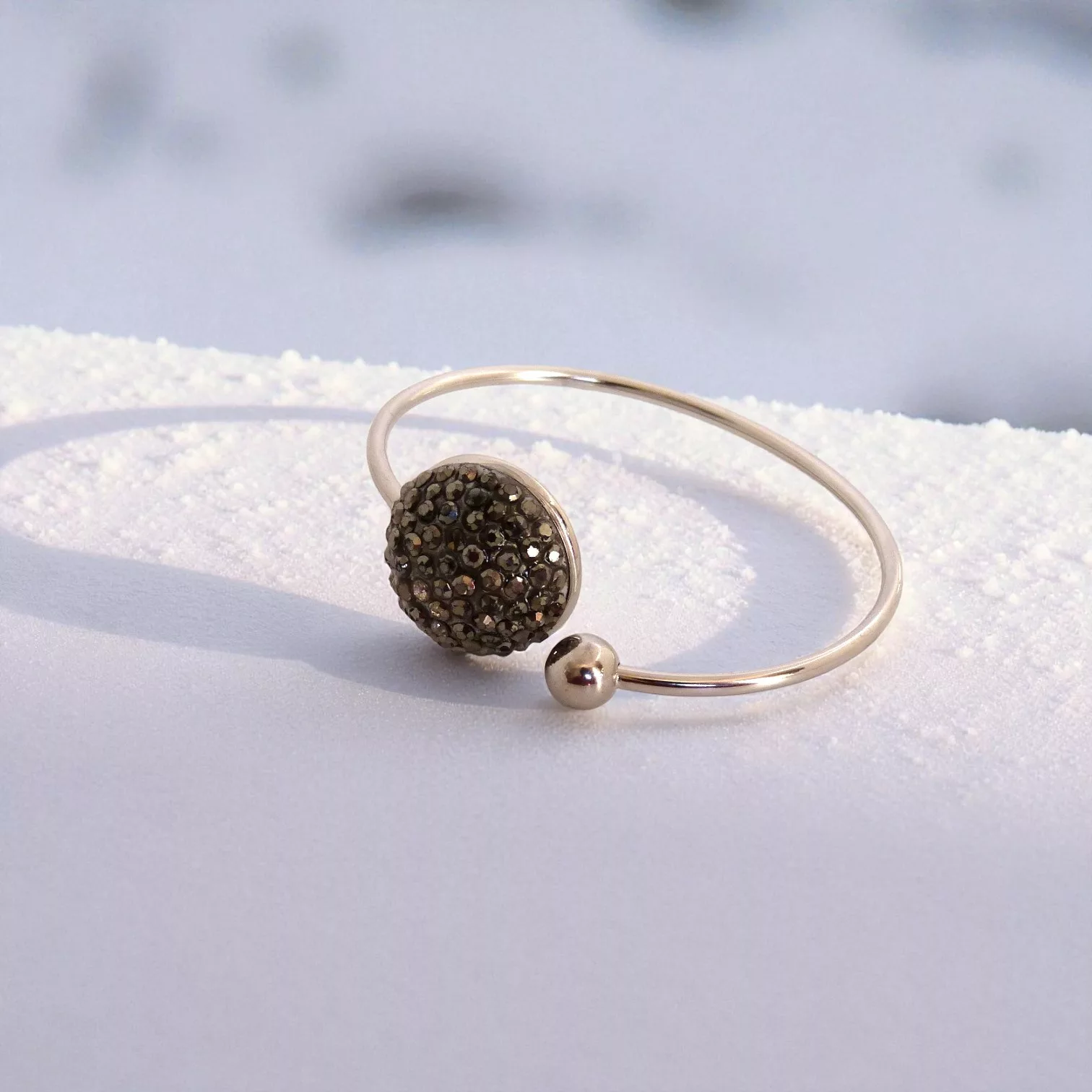 Le bracelet jonc Cristal noir est une pièce unique, façonnée à partir d’un ancien bouton vintage transformé en élément central serti de strass noirs. À l’opposé, une boule argentée lisse apporte équilibre et éclat. Léger et ajustable, ce bijou artisanal incarne l’élégance responsable.