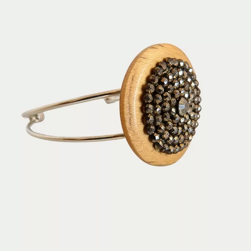A offrir ou à s’offrir! Ce superbe bracelet est issu de la réunion de deux boutons anciens. C’est une création unique et très originale ornée de perles grises à facettes sur un socle en résine imitation bois. Bracelet semi rigide adaptable à tous les poignets.