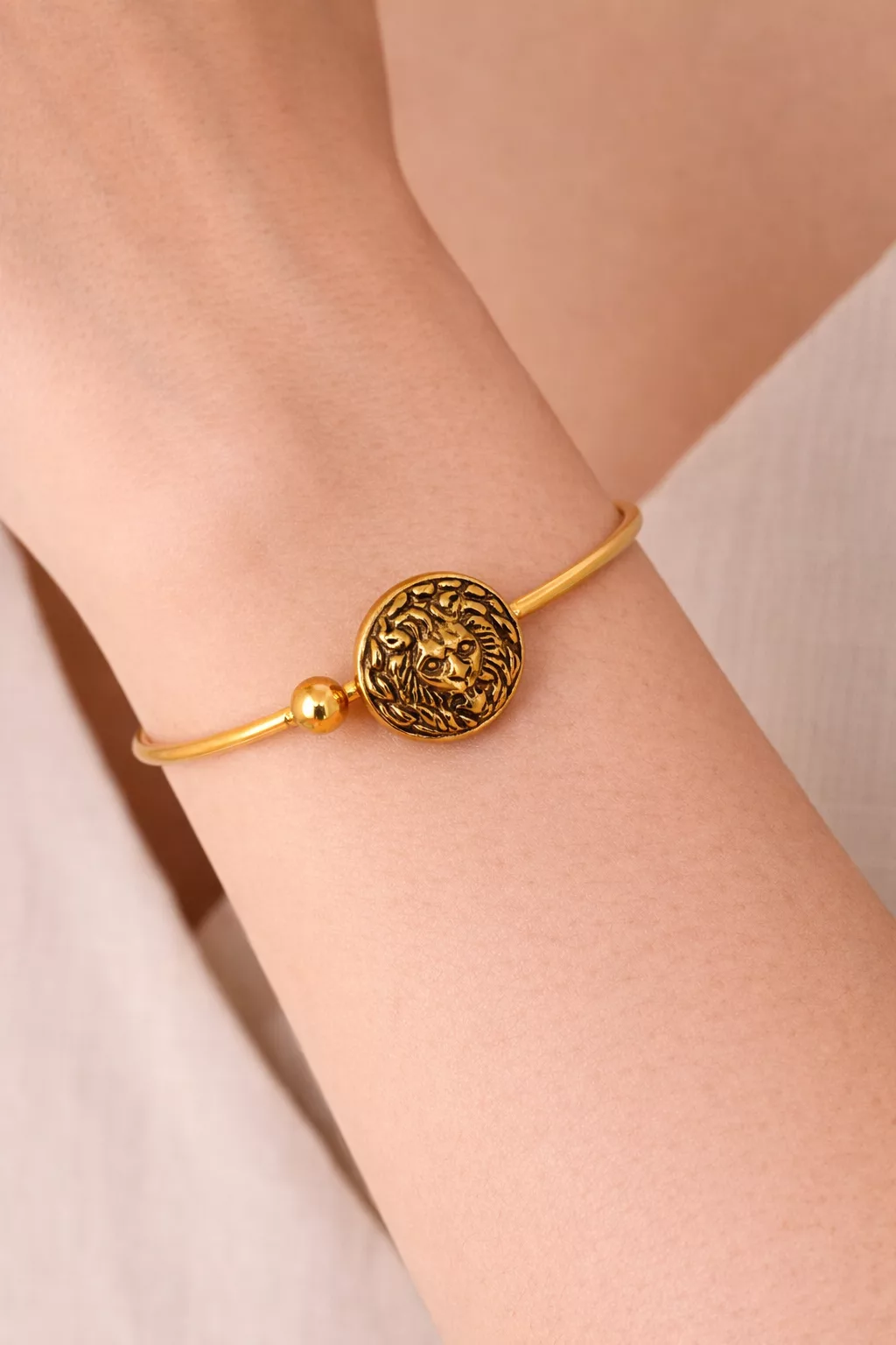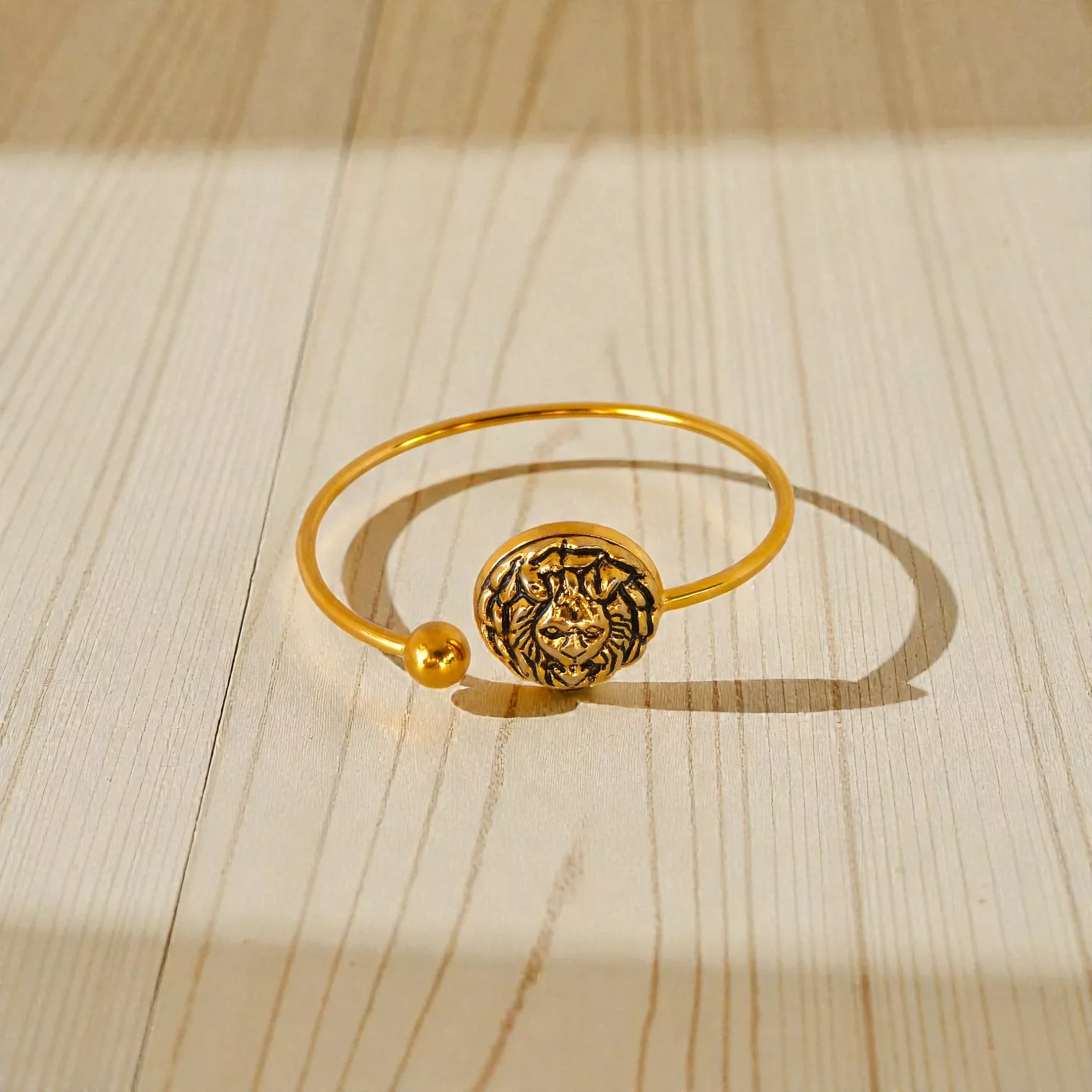 Monté sur un jonc doré fin et lumineux, le lion en relief capte la lumière et le regard. L’ensemble crée un équilibre subtil entre caractère vintage et élégance contemporaine.