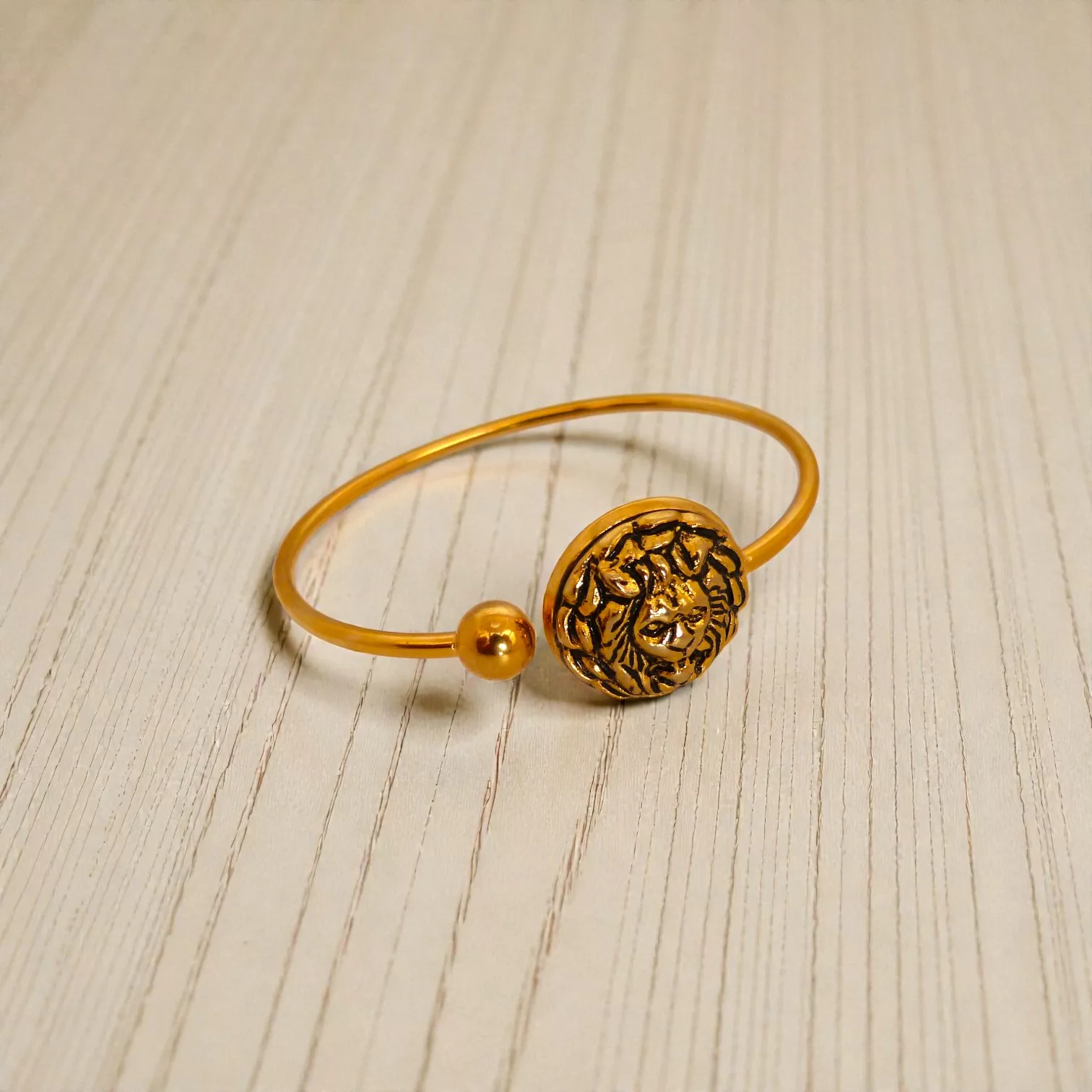 • Matériaux : Bouton ancien recyclé à motif de lion, jonc en métal doré