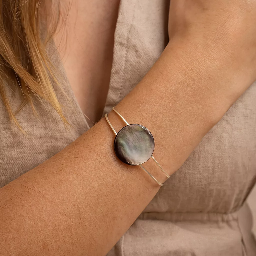 - Pièce unique : aucune nacre ne reflète la lumière de la même façon, ce qui rend chaque bracelet singulier.
