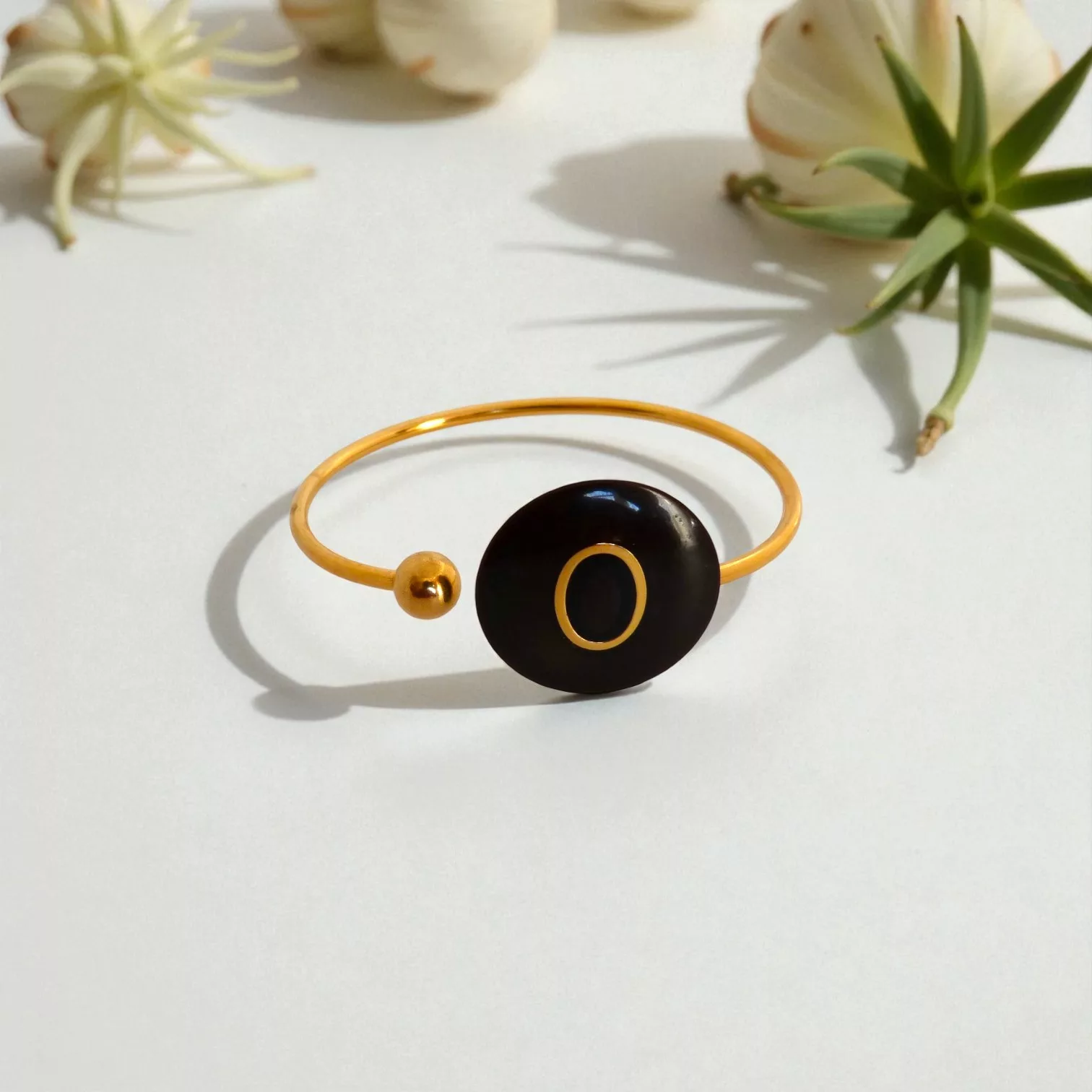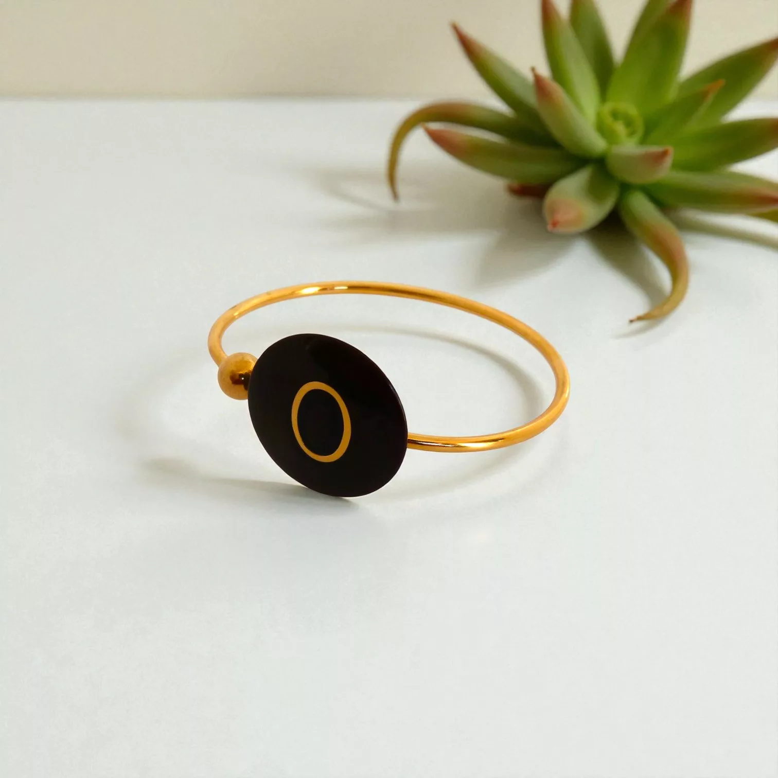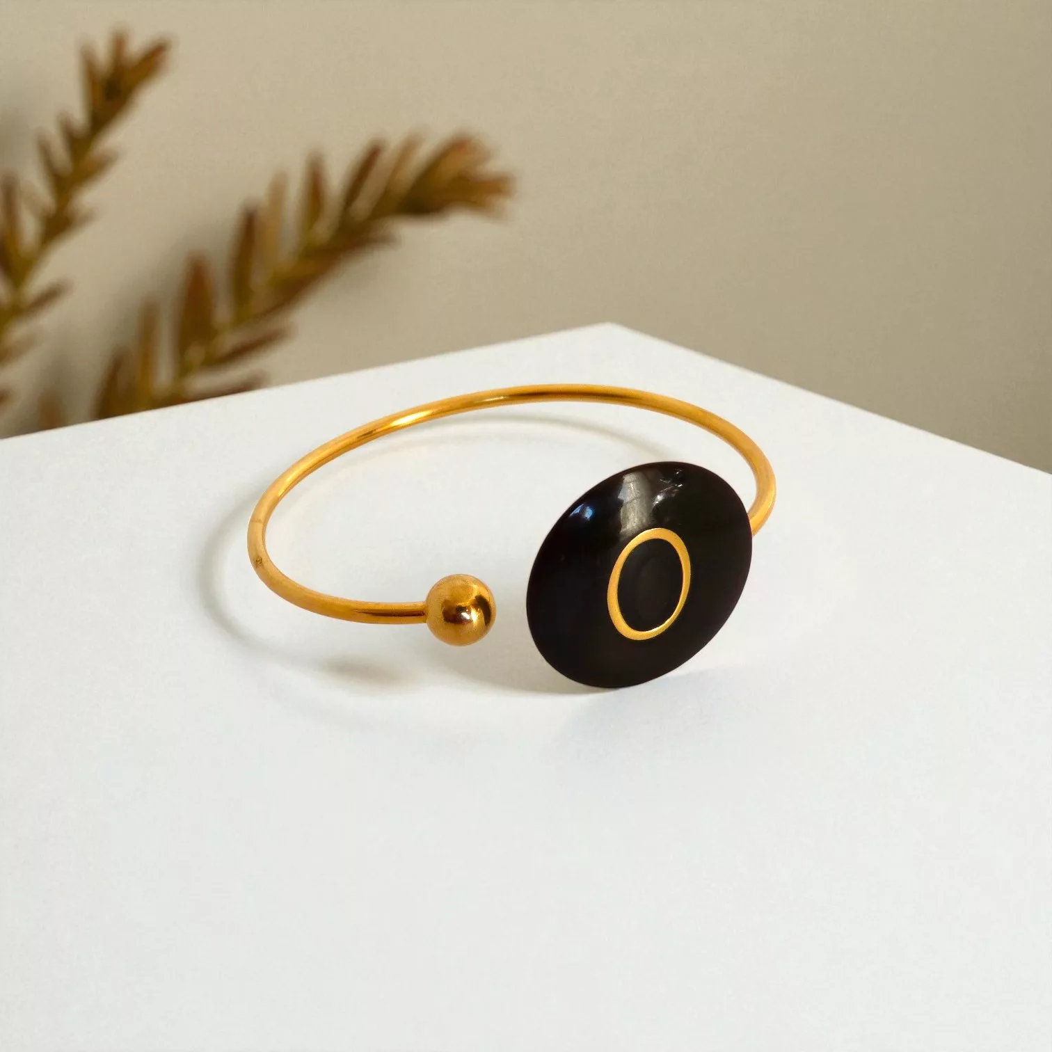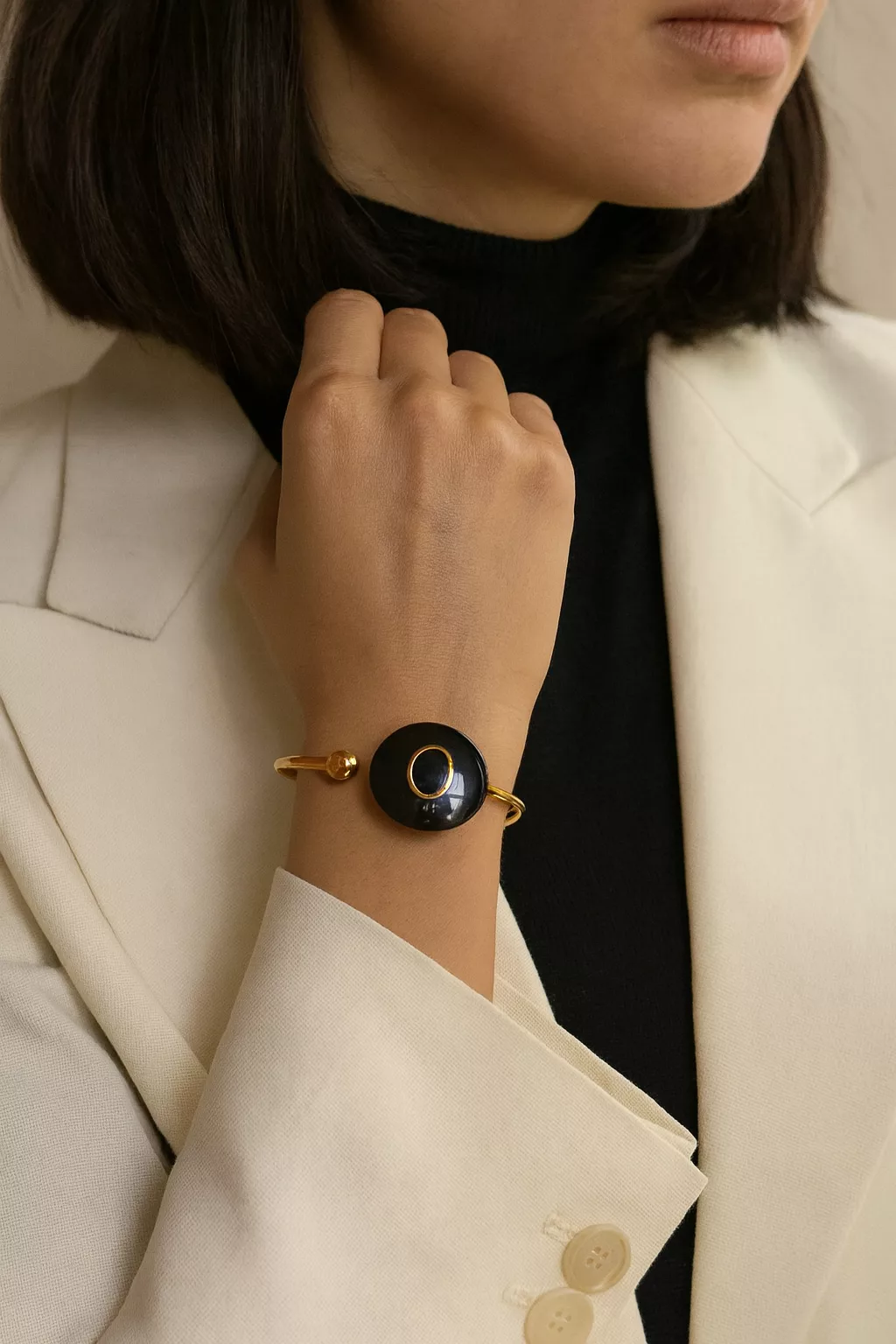 Le bracelet Ô élégant et minimaliste a été réalisé à partir d’un ancien bouton vintage. Sa forme épurée et son contraste noir & or en font un accessoire chic, facile à porter au quotidien comme pour une tenue plus habillée.