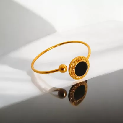 Ce bracelet Or & Nuit élégant et minimaliste est confectionné à partir d’un ancien bouton , monté sur un jonc doré ouvert. La partie centrale révèle un cabochon rond noir entouré d’un délicat motif perlé doré, apportant un style à la fois vintage et moderne.