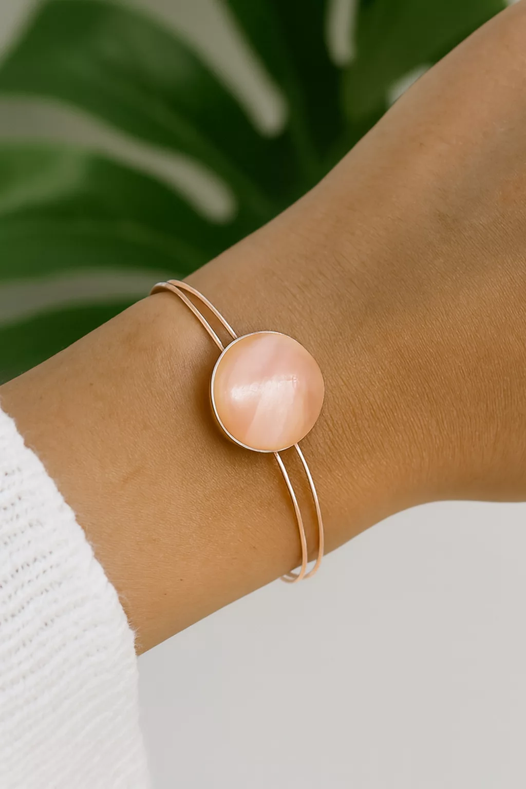 Le bracelet » Trésor nacré » jonc argenté à double bande met en lumière un bouton rose nacré, issu d’un vêtement vintage.Ce bouton devient le cœur d’un bijou délicat, à la fois solaire et romantique.Sa teinte douce évoque les reflets d’un coquillage au bord de l’eau, tandis que la structure argentée souligne la finesse du poignet.