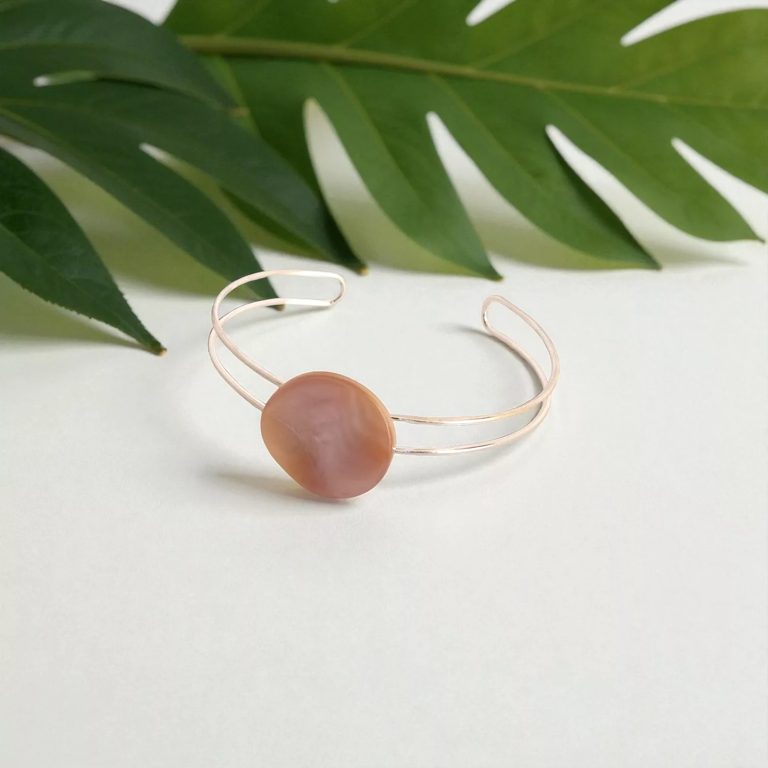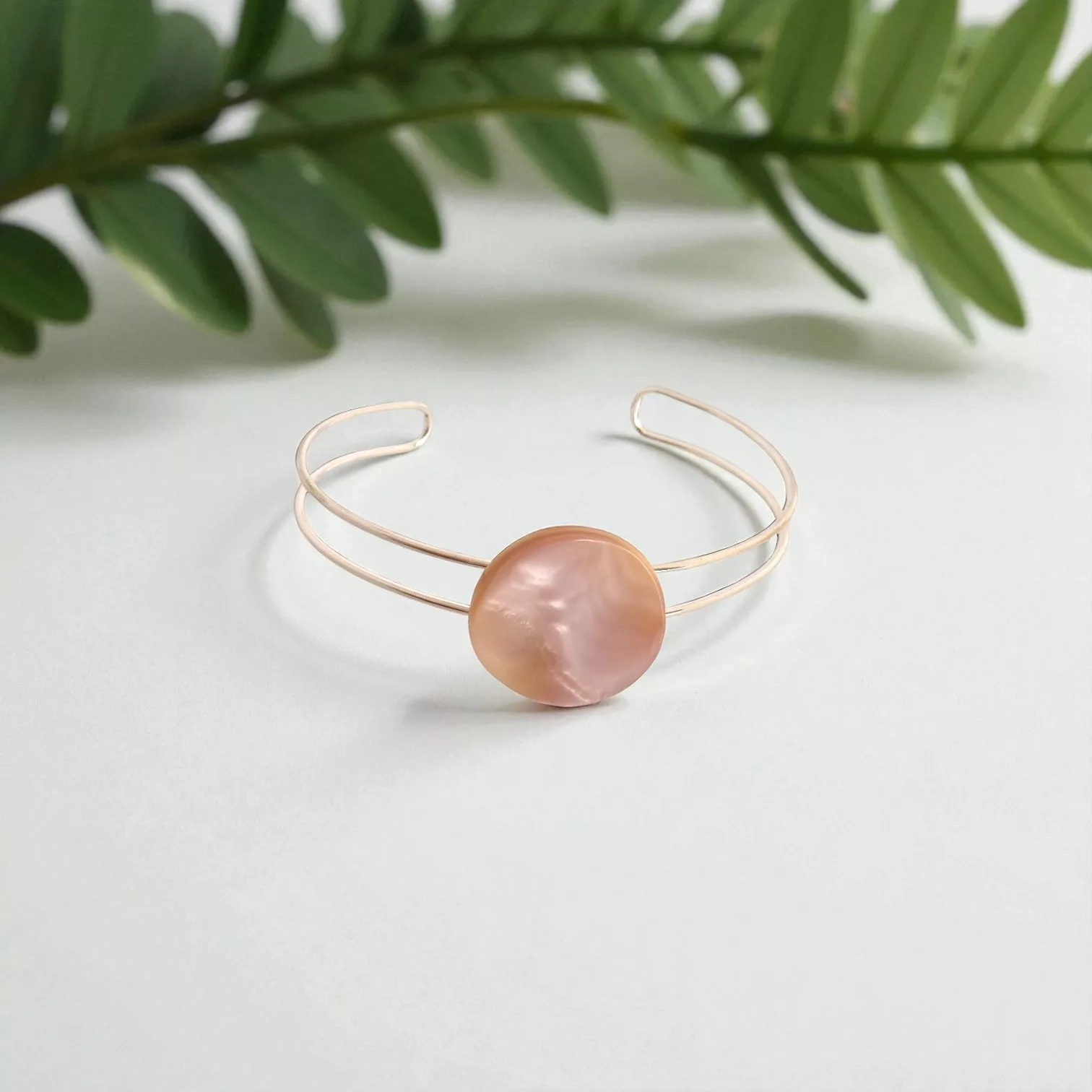 - Matériaux : bouton en nacre naturelle upcyclée monté sur double jonc fin en laiton plaqué argent